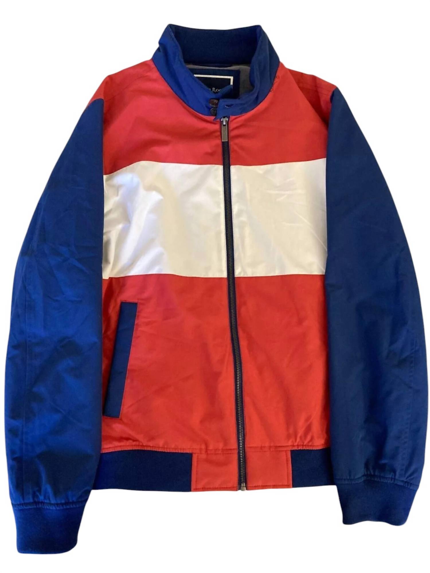 Discover the Club Room Men's Bomber Jacket, a stylish and lightweight addition to your wardrobe. This jacket features long sleeves and a stand collar with both button-tab and full-zip front closures for versatile wear. Crafted from 100% polyester with a 100% polyurethane back, this bomber jacket is lined, water-resistant, and machine washable for easy care. Equipped with multiple pockets, including two front hand pockets and an interior zipper pocket, it's available in striking Red, Blue, and White stripe patterns.