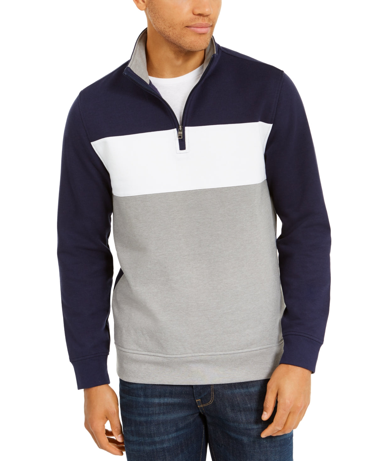 Leve seu estilo e conforto para o clima frio a um novo patamar com o colorblock contemporâneo e o fleece supermacio deste moletom com zíper de um quarto da Club Room