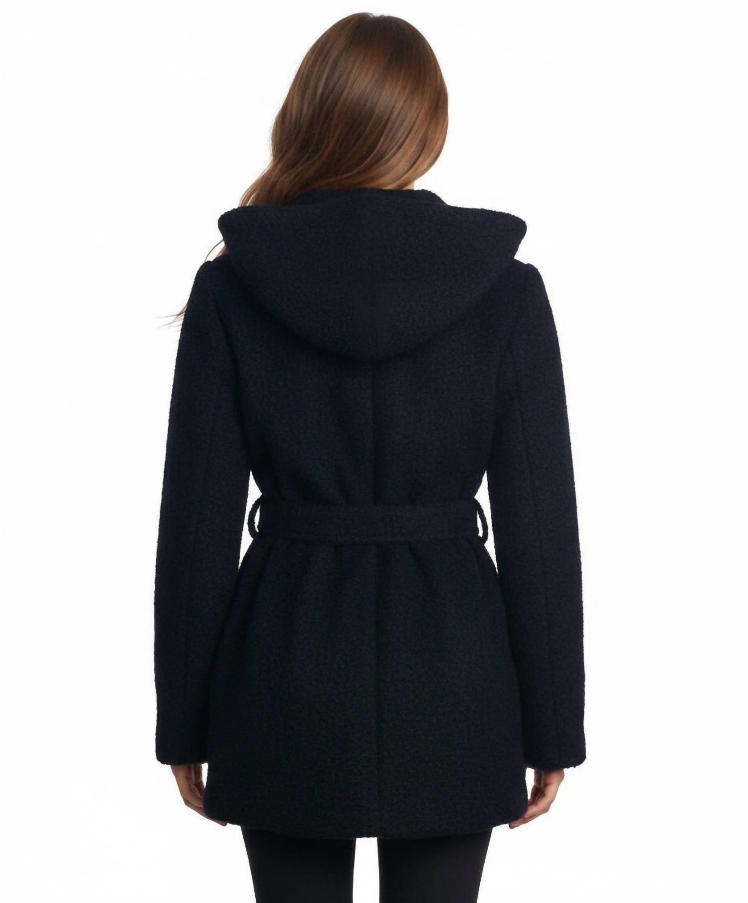 Designed beautifuly, you'll be reaching for this pea coat season after season. Introducing the Hooded Boucle Coat With Waist Tie by CoffeeShop, a chic addition to your winter wardrobe. This long sleeve, solid black coat is crafted for both comfort and style with a cozy hood and a flattering wrap closure. Made for vacations or a stylish New Year's Eve outing, its sophisticated monochrome design embodies effortless elegance. For best care, dry cleaning is recommended.