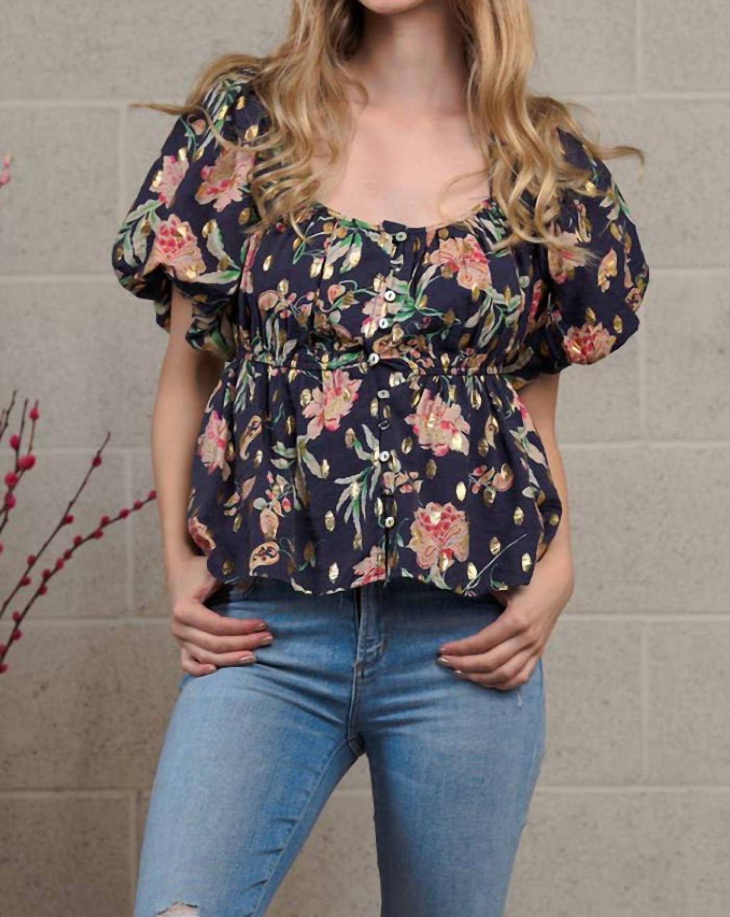 Descubra a Blusa Floral Bufante com Botões da Collective Rack, uma blusa azul deslumbrante, perfeita para qualquer ocasião de verão. Esta blusa apresenta charmosas estampas florais e mangas curtas bufantes, com um elegante decote redondo e fechamento por botões. Confeccionada em uma mistura de 70% Viscose e 30% Nylon para um ajuste confortável, ela possui cós elástico estilo império com detalhe de amarração nas costas. Ideal para ir à igreja, esta blusa versátil oferece estilo e conforto durante toda a estação.