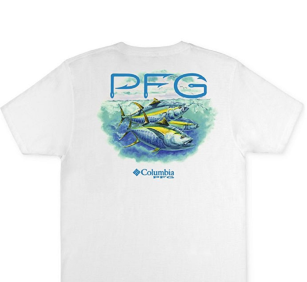 Esta camiseta gráfica da Columbia Performance Fishing Gear apresenta uma imagem realista de peixes nadando. | Caimento regular | Gola redonda | Gráfico na frente e atrás | 100% algodão | Lavável à máquina | Importado