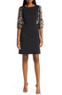 Connected little black dress featuring metallic embroidery on sheer three-quarter sleeves for a subtle shimmer. The bateau neckline and 38-inch length create a refined, timeless silhouette suitable for evening, cocktail, and special occasions.