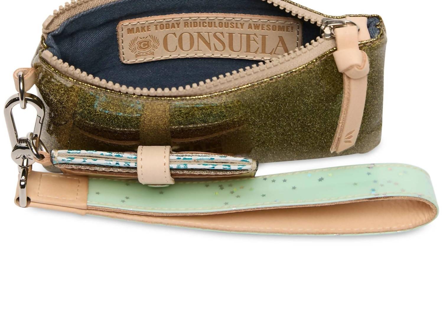 The perfect clutch for an evening out on the town. Meet the Women's Oly Wristlet by Consuela, an innovative blend of practicality and style in olive green. This chic accessory comes with a Diego leather five-slot card wallet featuring a secure D-ring, a pocket pouch, and a turquoise glitter wristlet, all beautifully trimmed in natural, untreated leather. Measuring 5 inches high by 8 inches wide for the pouch, and 3 by 4 inches for the cardholder, with a 9-inch wristlet strap, this piece is perfect for managing your essentials. Proudly made in Mexico, it's the perfect combination of elegance and functionality.
