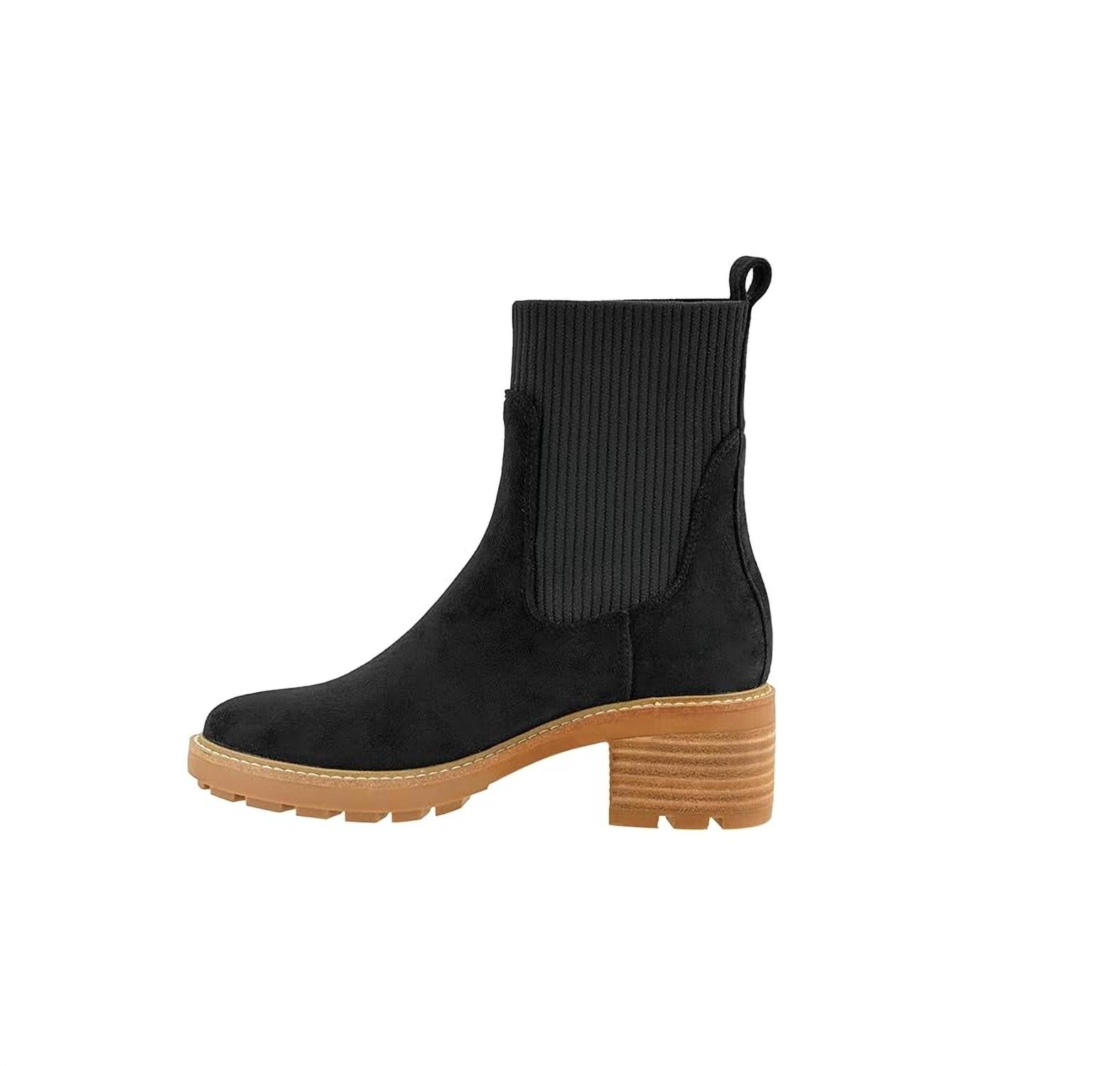 These boots feature a faux suede upper with a rubber sole and cushioned insoles for comfort. The stretchy sock-top upper provides a secure fit, and they have a pull-on design. The boots include a 2.75" heel and a 1" platform for added height.