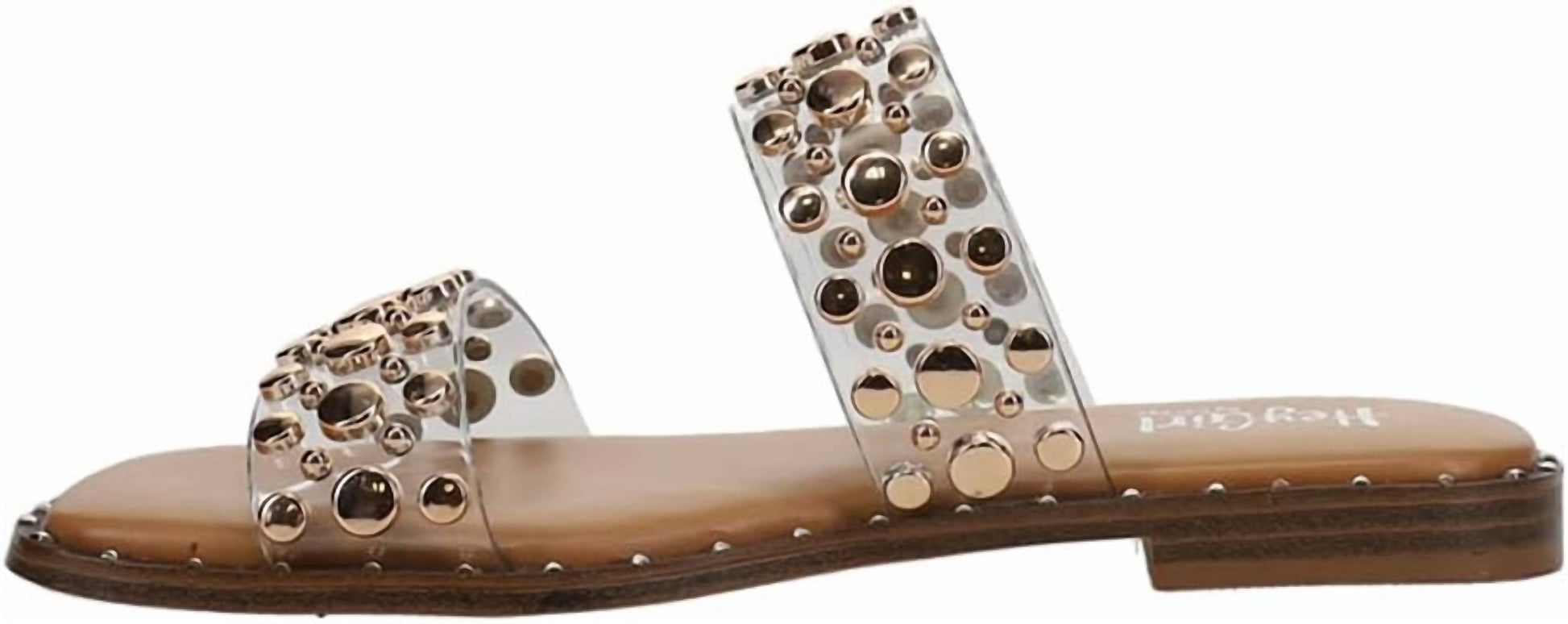 Synthetic. Not Water Resistant. About this item: Padded insoles. Stud embellishments. Slip-on sandal.