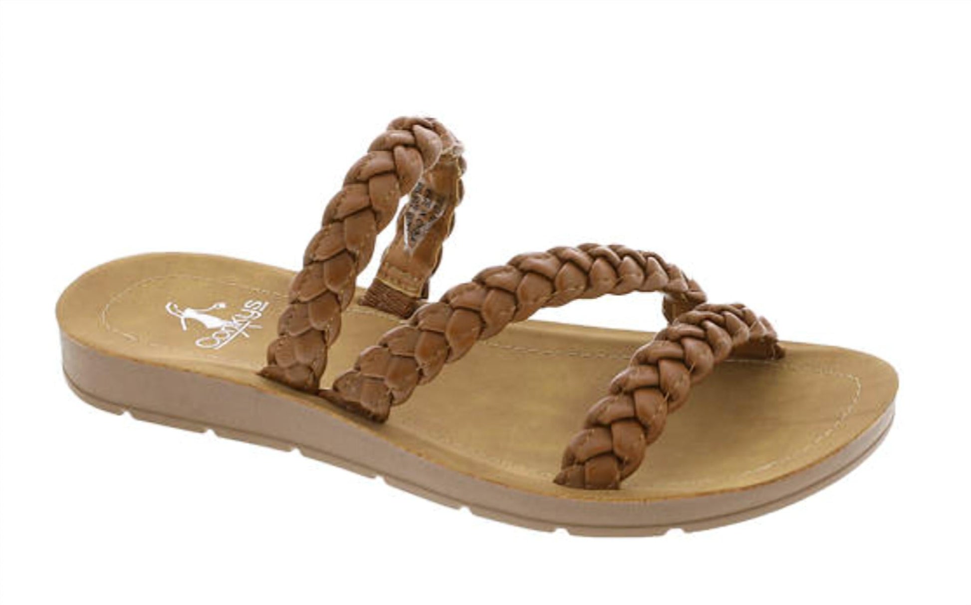 These sandals feature braided straps, a casual slide design, and a strappy synthetic upper. They offer a slip-on fit, a lightly cushioned footbed, and a 3/4" heel height.