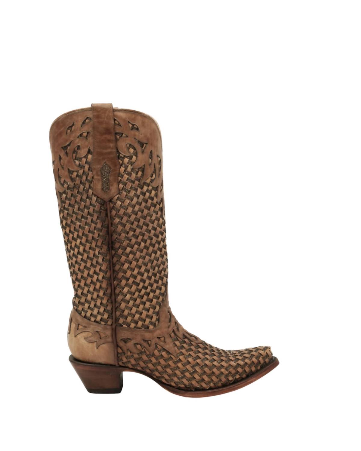 Estas botas de cano alto apresentam um cano de couro bovino de 33 cm com um design de glitter trançado e bico fino. O forro é de couro de porco. Para manter a aparência, limpe a sujeira com um pano macio, condicione o couro, evite umidade e trate o glitter delicadamente, sem produtos químicos agressivos.