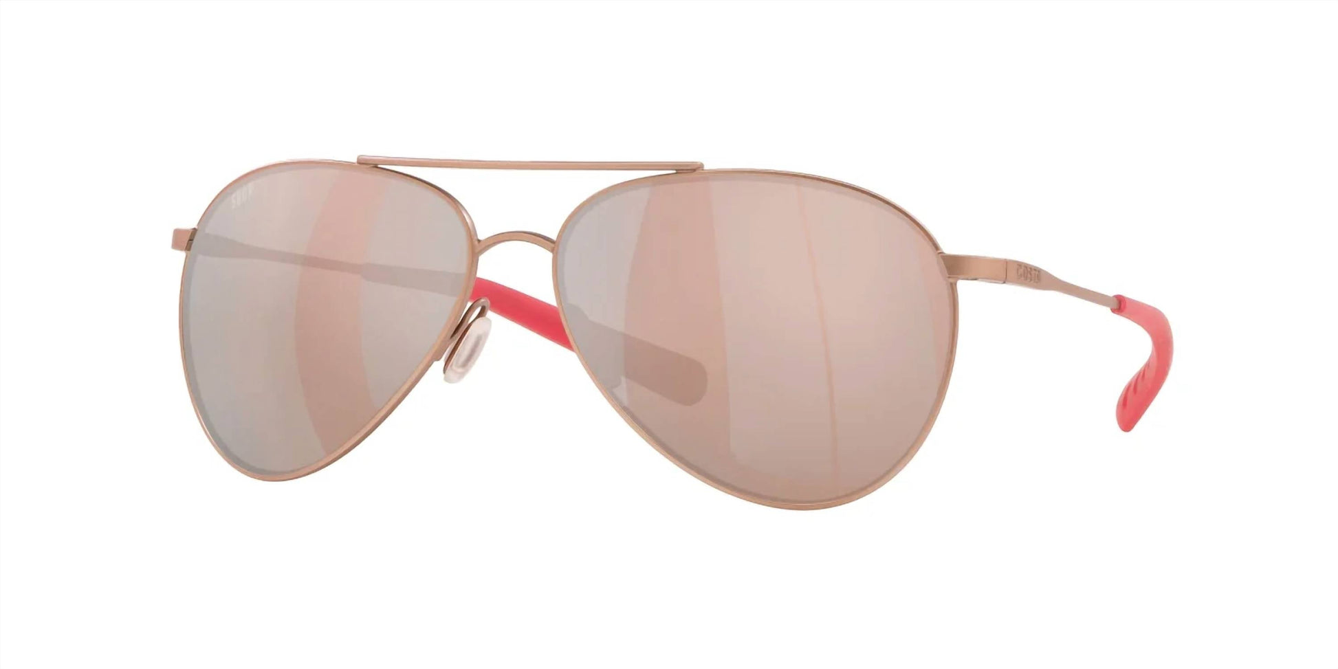 The Costa Del Mar Men's Piper Sunglasses in Satin Rose Gold offer a modern take on the aviator style. Made with a premium blend of Titanium and Beta-Titanium, these sunglasses feature Polarized Polycarbonate lenses in a Copper Silver Mirror finish, ensuring both durability and style. Designed with adjustable Hydrolite® nosepads and temple sleeves, they prevent slippage for a comfortable fit. Dimensions include a frame width of 134 mm, bridge width of 14 mm, lens width of 58 mm, lens height of 47 mm, and temple arm length of 135 mm.