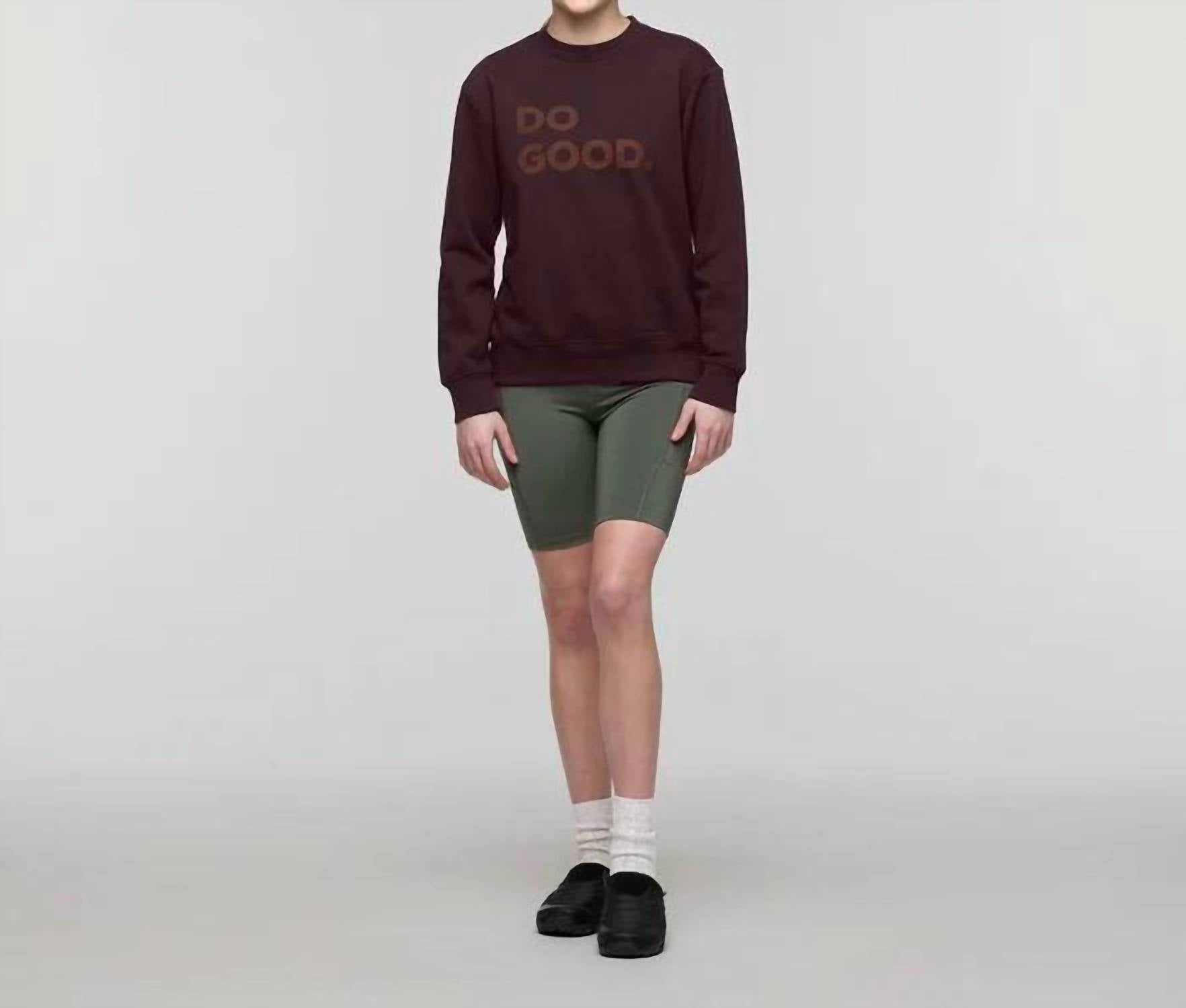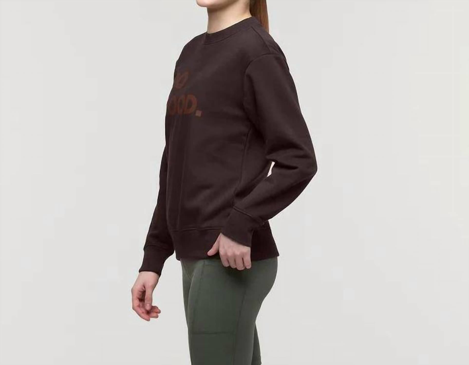 Introducing the Do Good Crew Sweatshirt by Cotopaxi, a sustainable choice crafted in coffee color perfect for eco-conscious fashion. This women’s sweatshirt is made from 76.5% organic cotton and 23.5% recycled polyester with contrast retro piping at the shoulder seam for a classic fit. Featuring long sleeves and a ribbed cuff and hem, it offers a trendy streetwear look suitable for fall vacations and Thanksgiving occasions. Closure: Pull on. Care: Machine wash and tumble dry.