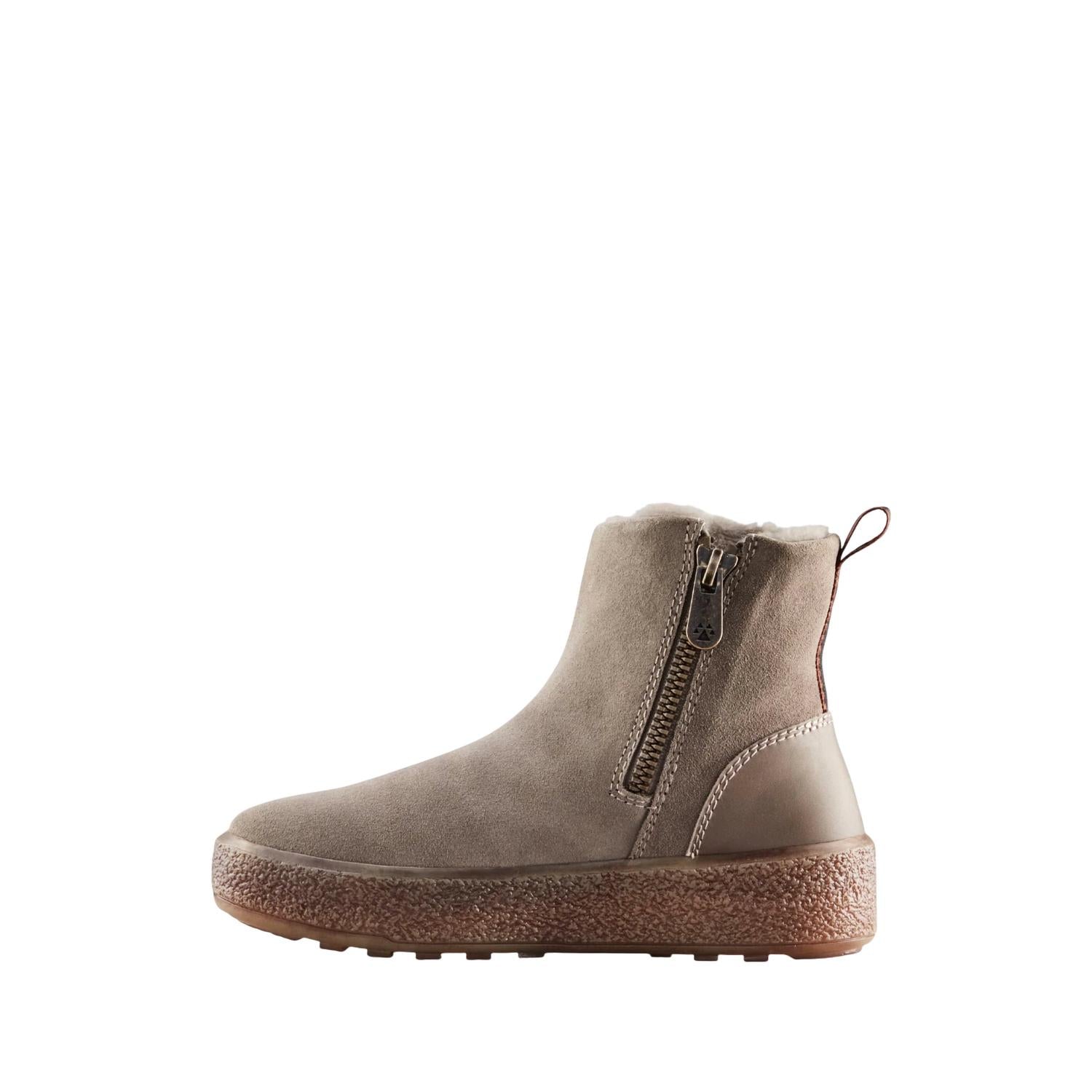 Bota cano alto com zíper interno em latão envelhecido. Forro em lã de cordeiro genuína. Biqueira amendoada. Solado de borracha termoplástica com acabamento crepe. Palmilha removível de espuma moldada. Solado de borracha termoplástica antiderrapante.