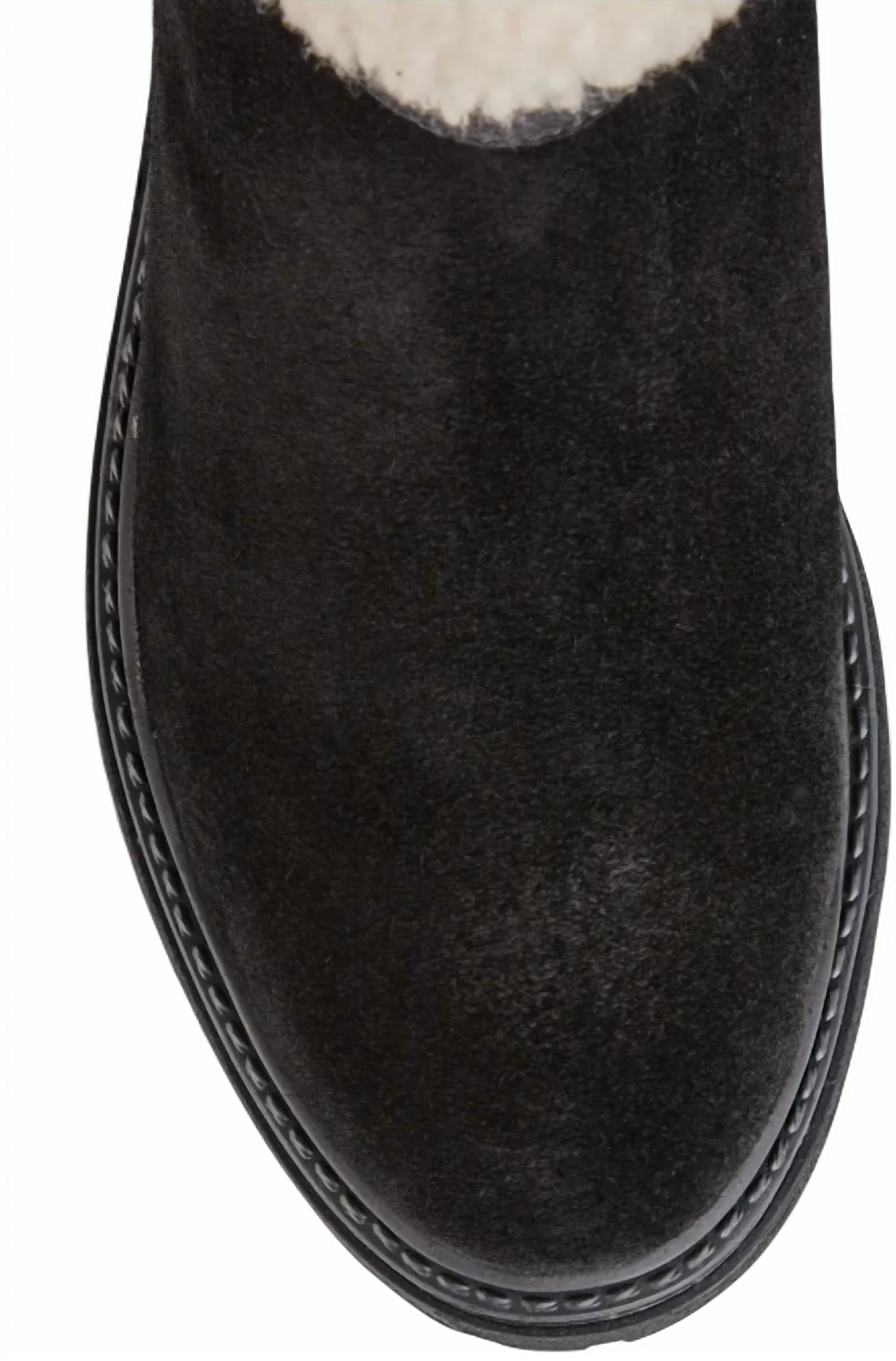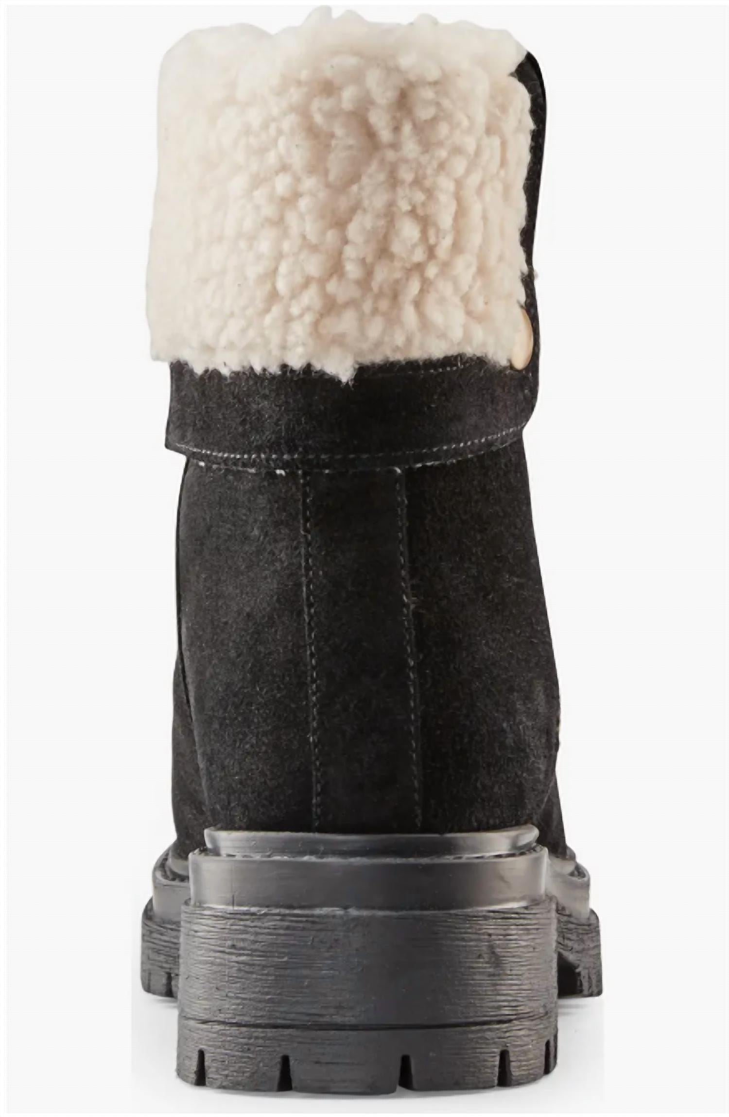 Punho macio de pele de carneiro sintética em bota de camurça com palmilha de espuma moldada. Cano de 15 cm. À prova d'água. Palmilha removível e acolchoada. Cabedal em couro. Forro têxtil. Sola sintética.