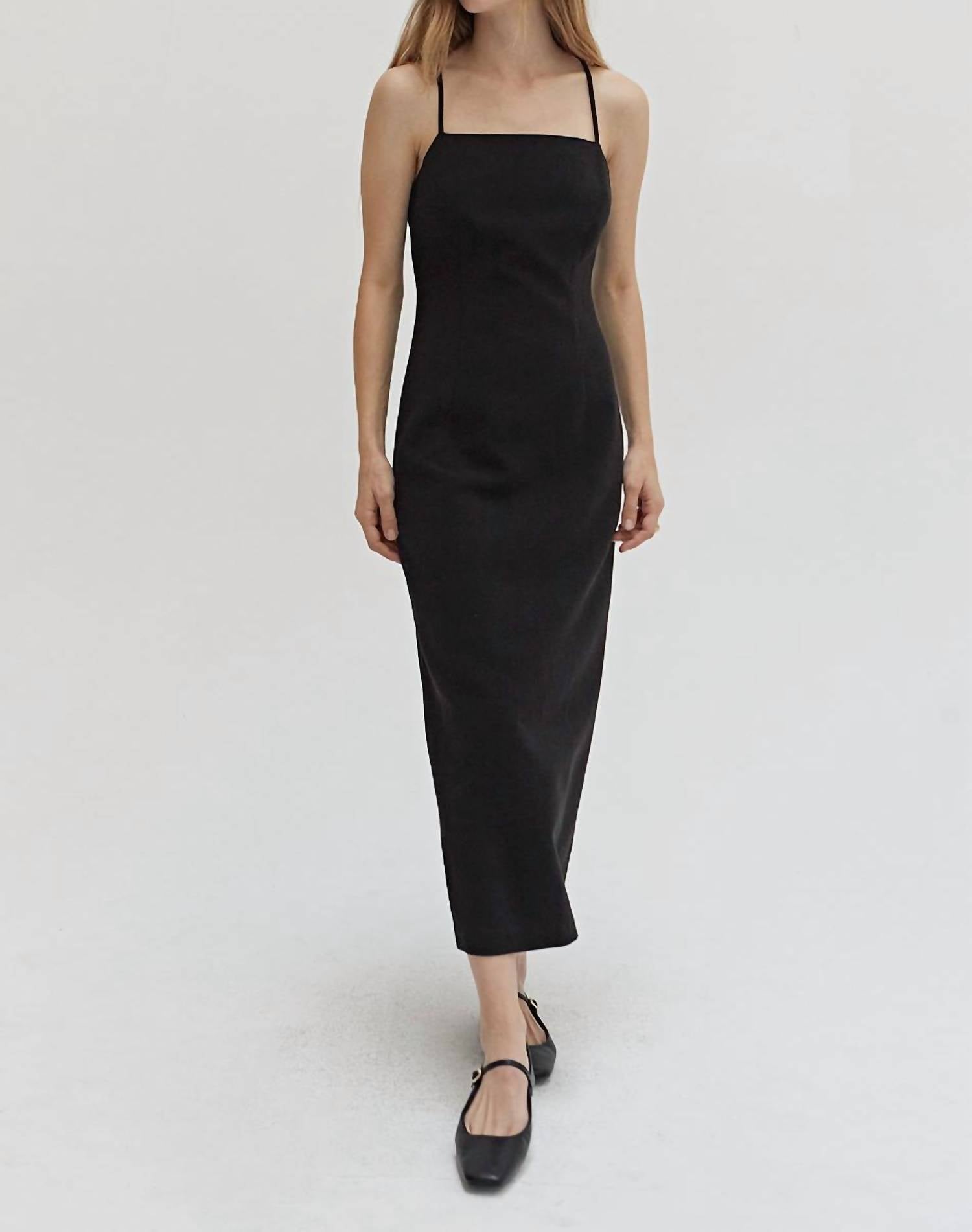 Um vestido midi tão versátil que suas opções de uso são infinitas. Com alças finas e decote reto, este vestido ostenta um sofisticado detalhe de alças cruzadas nas costas, além de um discreto zíper traseiro oculto. Confeccionado em uma mistura de 65% poliéster, 15% rayon, 8% tencel, 8% lã e 4% elastano, com forro 100% poliéster, oferece um corte em A elegante e uma fenda elegante nas costas. Os cuidados incluem lavagem à mão e secagem no varal.