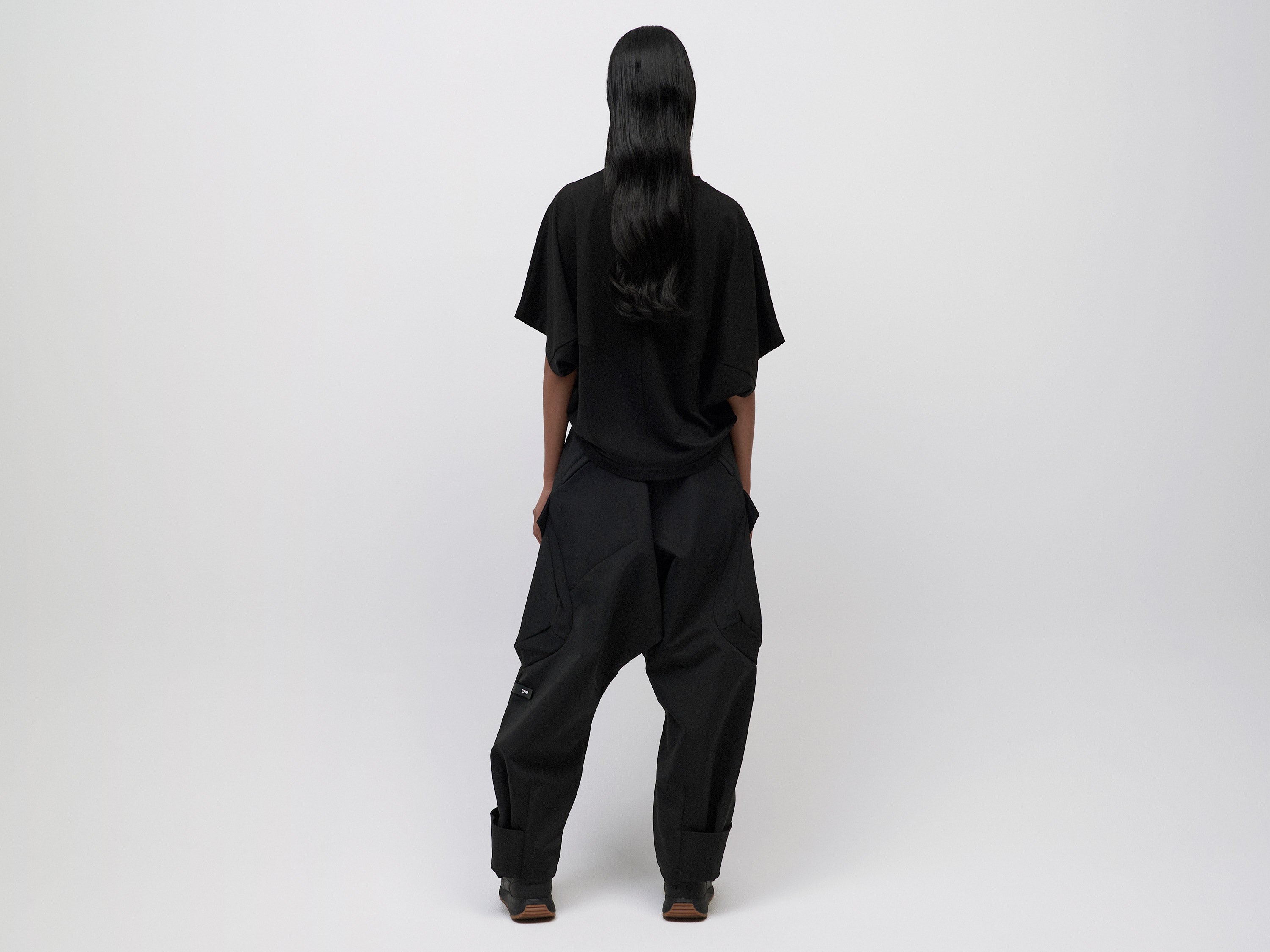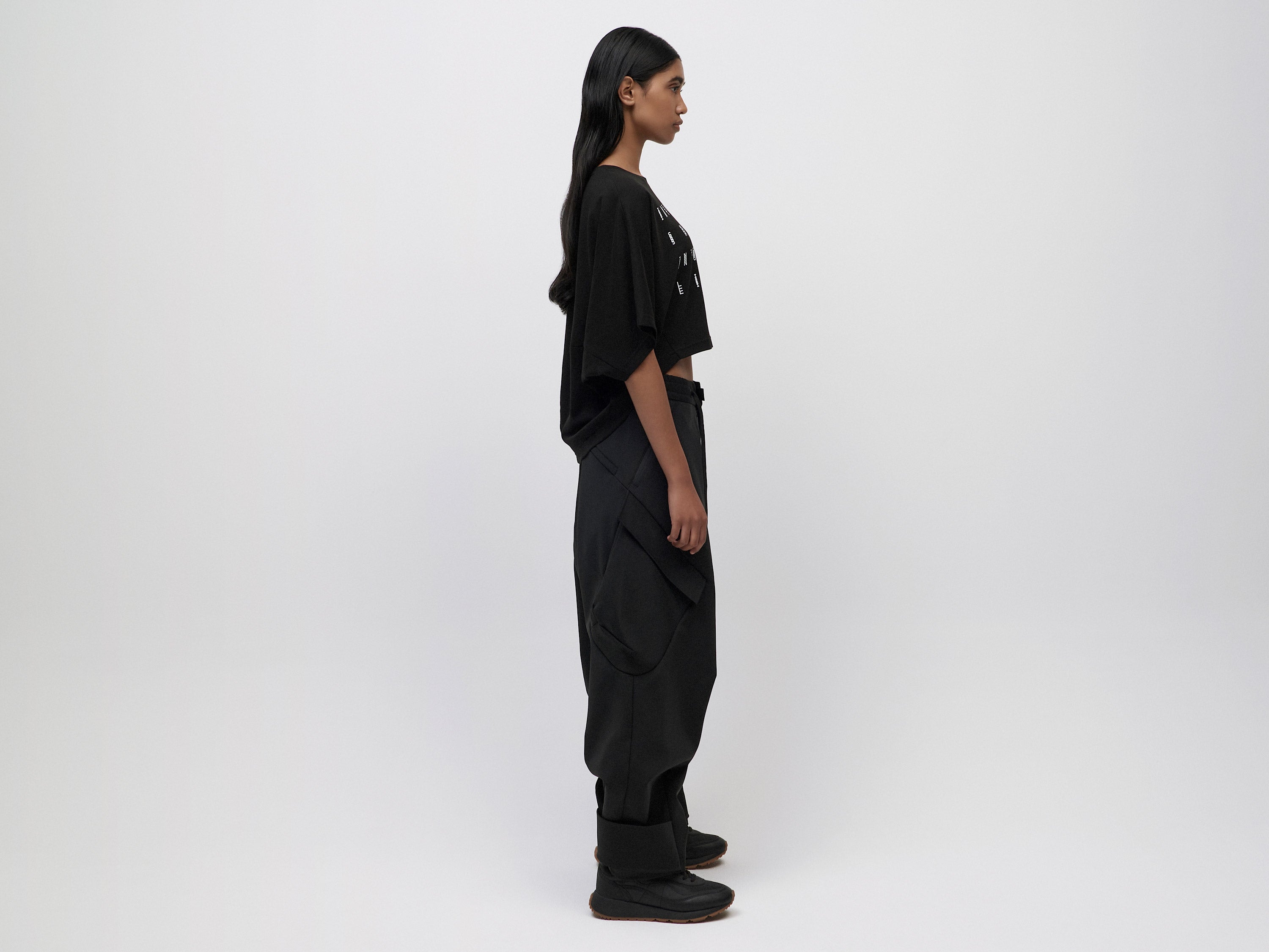 Our Cropped Tee combines fluid dropped sleeves, with a high/low hemline accentuating the neat front with the draped volume in the back. With its waisted front, this effortless crew neck t-shirt is an easy-fit essential crafted from luxurious organic cotton. Our "INTO THE SHADOW" print gives this playful t-shirt a graphic pop that allows for plenty of styling options all year round.