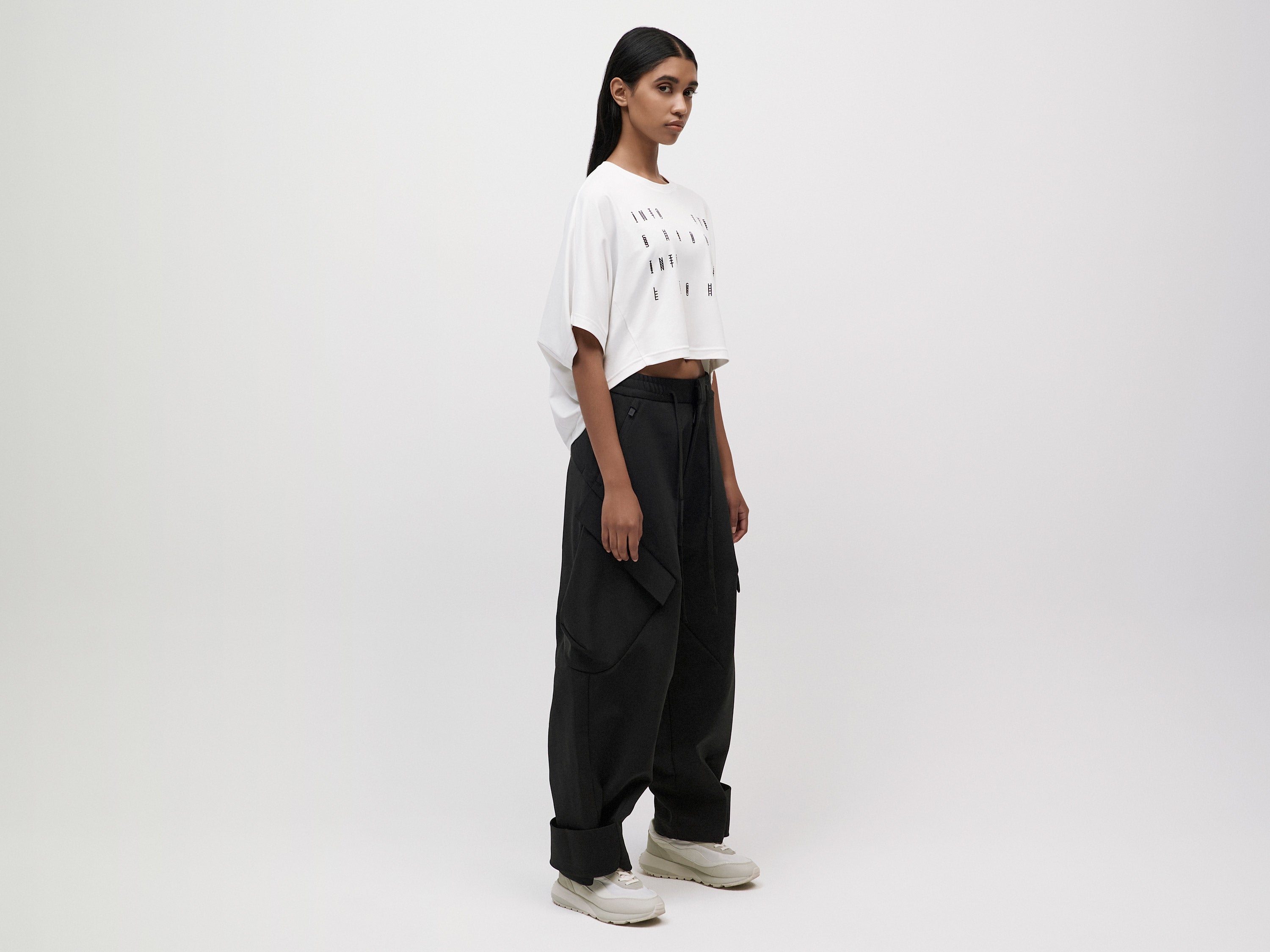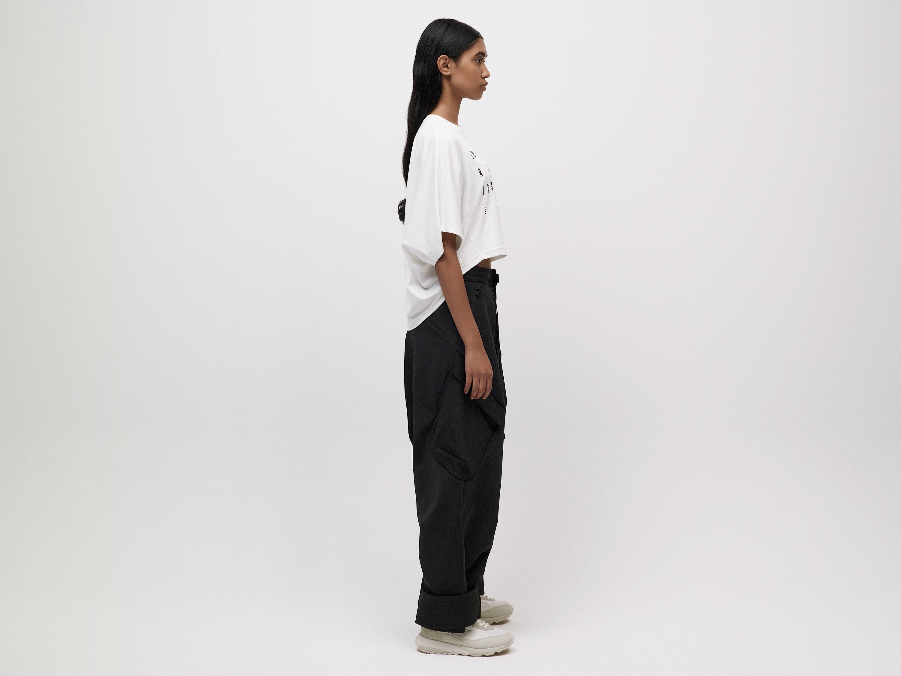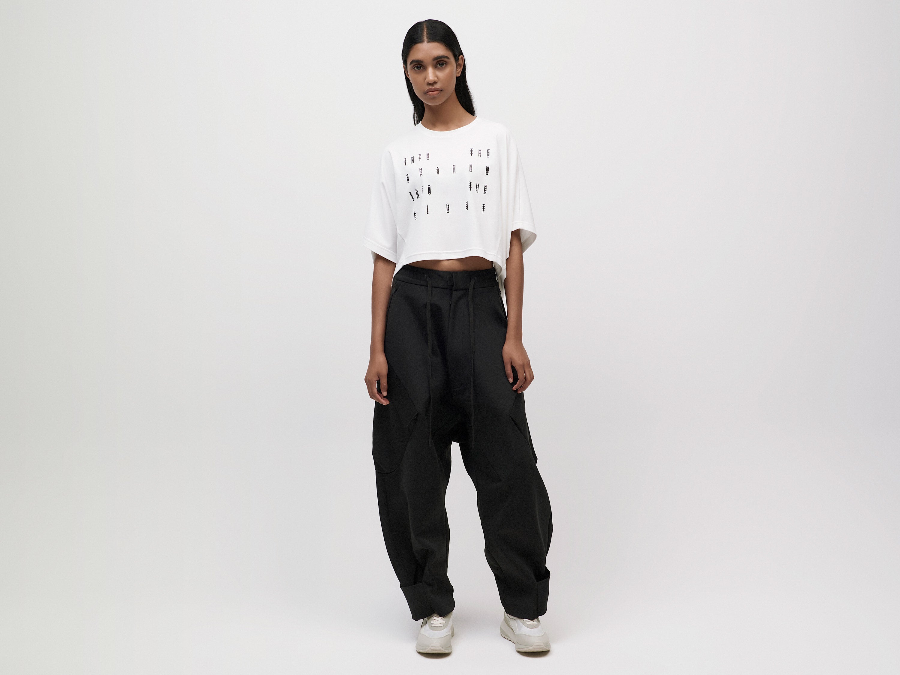 Our Cropped Tee combines fluid dropped sleeves, with a high/low hemline accentuating the neat front with the draped volume in the back. With its waisted front, this effortless crew neck t-shirt is an easy-fit essential crafted from luxurious organic cotton. Our "INTO THE SHADOW" print gives this playful t-shirt a graphic pop that allows for plenty of styling options all year round.