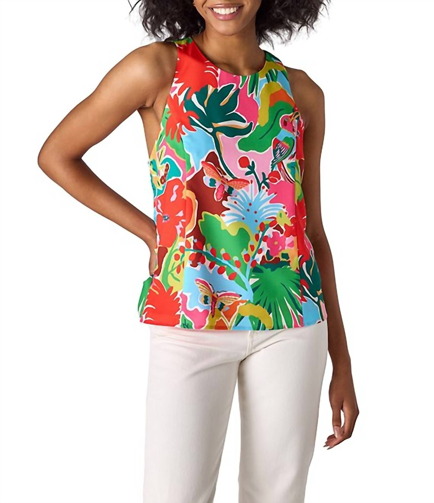 Perfect for layering or cute enough to wear it on its own. Introducing the Wynne Sleeveless Top by Crosby by Mollie Burch, a summer essential in vibrant Tropicana. This tank top features a crewneck and racerback design, providing a chic and bra-friendly fit with a hidden snap and loop for secure straps. Crafted from durable polyester, it closes with a zip closure for easy wear. Care for this versatile piece by hand washing and line drying to maintain its graphic pattern and stylish appeal.