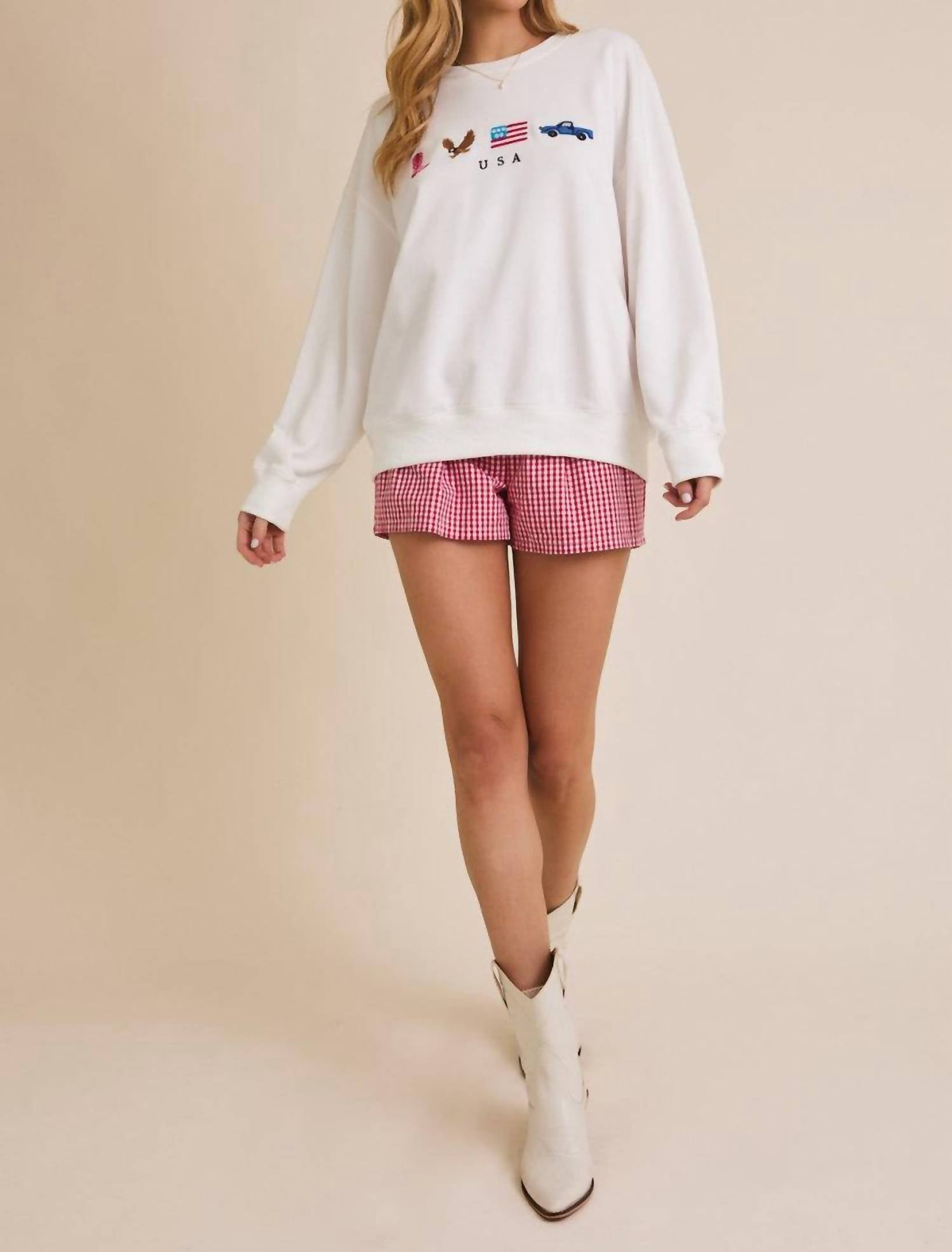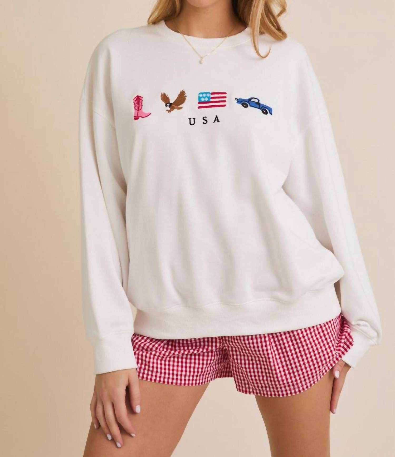 The ultimate go-to sweater, expertly crafted to provide the perfect combination of warmth and style. Its classic design and soft fabric make it a must-have addition to your wardrobe. Celebrate your patriotism with the Daisy All American Embroidered Crewneck Sweatshirt, a stylish white knit top perfect for any streetwear-inspired look. This long sleeve, crewneck sweatshirt boasts a "USA" graphic, adding a touch of holiday spirit to your wardrobe. Crafted from a soft blend of 67% polyester and 33% cotton, this piece offers ultimate comfort while ensuring breathability. With a convenient pull-on closure, it is easy to style for casual occasions or festive gatherings. Care: Machine wash and tumble dry.