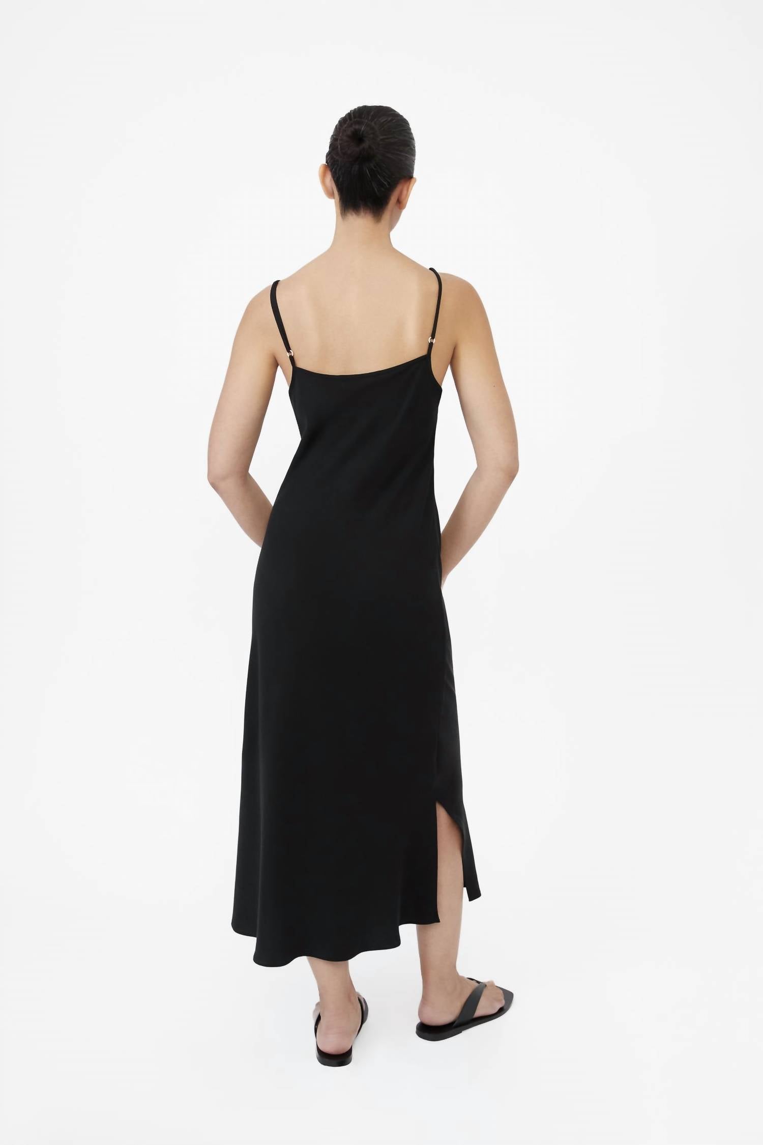 O vestido com o comprimento perfeito existe. Apresentamos o Vestido Cupro Bias Slip da Dāl the Label, uma peça atemporal em preto sólido, criada para uma elegância moderna. Este vestido possui alças finas e decote em V, confeccionado em luxuoso 100% cupro, proporcionando um toque sedoso, respirável e hipoalergênico. Com comprimento midi e corte reto, oferece versatilidade para qualquer ocasião, de passeios casuais a eventos noturnos. Fabricado em um país indefinido, este vestido deve ser lavado à mão e seco na horizontal, garantindo sua longevidade no seu guarda-roupa.
