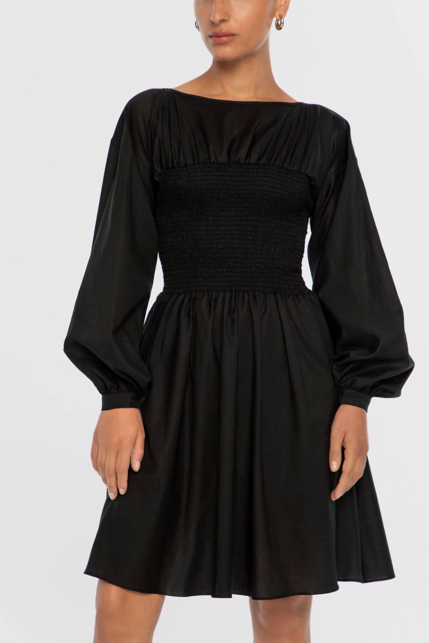 O Vestido Smocked da Dāl the Label incorpora um espírito romântico com seu design elegante. Este vestido preto minimalista apresenta mangas longas bufantes com punhos abotoados e um decote canoa elegante. Confeccionado em uma luxuosa mistura de algodão, apresenta um padrão texturizado e um corpete elástico franzido, finalizando com uma saia evasê que vai logo acima do joelho. Ideal para eventos noturnos de primavera, este modelo com corte justo e flare requer lavagem a seco para um cuidado ideal. Fechamento: Modelo pull-on.