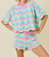 Elevate your vacation wardrobe with the Tropical Waves Matching Set by day + moon, crafted for women who love boho chic style. This loungewear set features a short sleeve, oversized flowy top with a crewneck, and comfy drawstring shorts, both adorned with vibrant pastel wavy stripes. Made of 100% cotton, this lightweight set is ideal for summer days and playful vibes. Care: Machine wash. Model Lauren, standing at 5’5” and wearing size small, showcases its delightful charm.