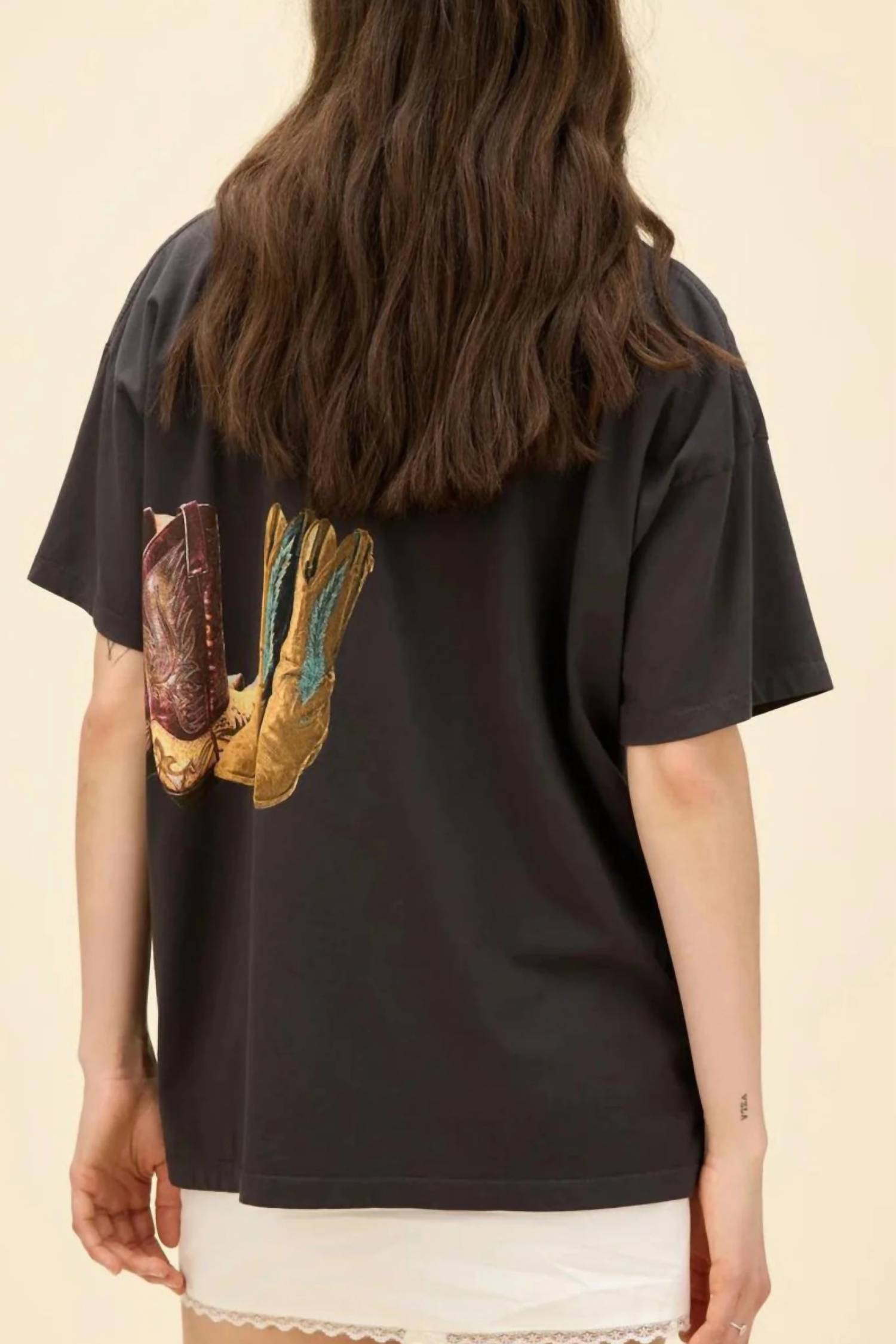This classic, short sleeve tee will be your go-to staple this season and beyond. Introducing the DAYDREAMER Kick Off Your Boots Merch Tee, a spirited addition to your western-inspired wardrobe. This short sleeve tee, in reactive black, showcases a playful multi-cowboy boot graphic across the chest. Crafted from high-quality cotton, it offers a classic crewneck design and convenient pull-on closure. For easy care, machine wash and line dry. Perfect for music festivals, this streetwear piece effortlessly blends into any Spring collection.