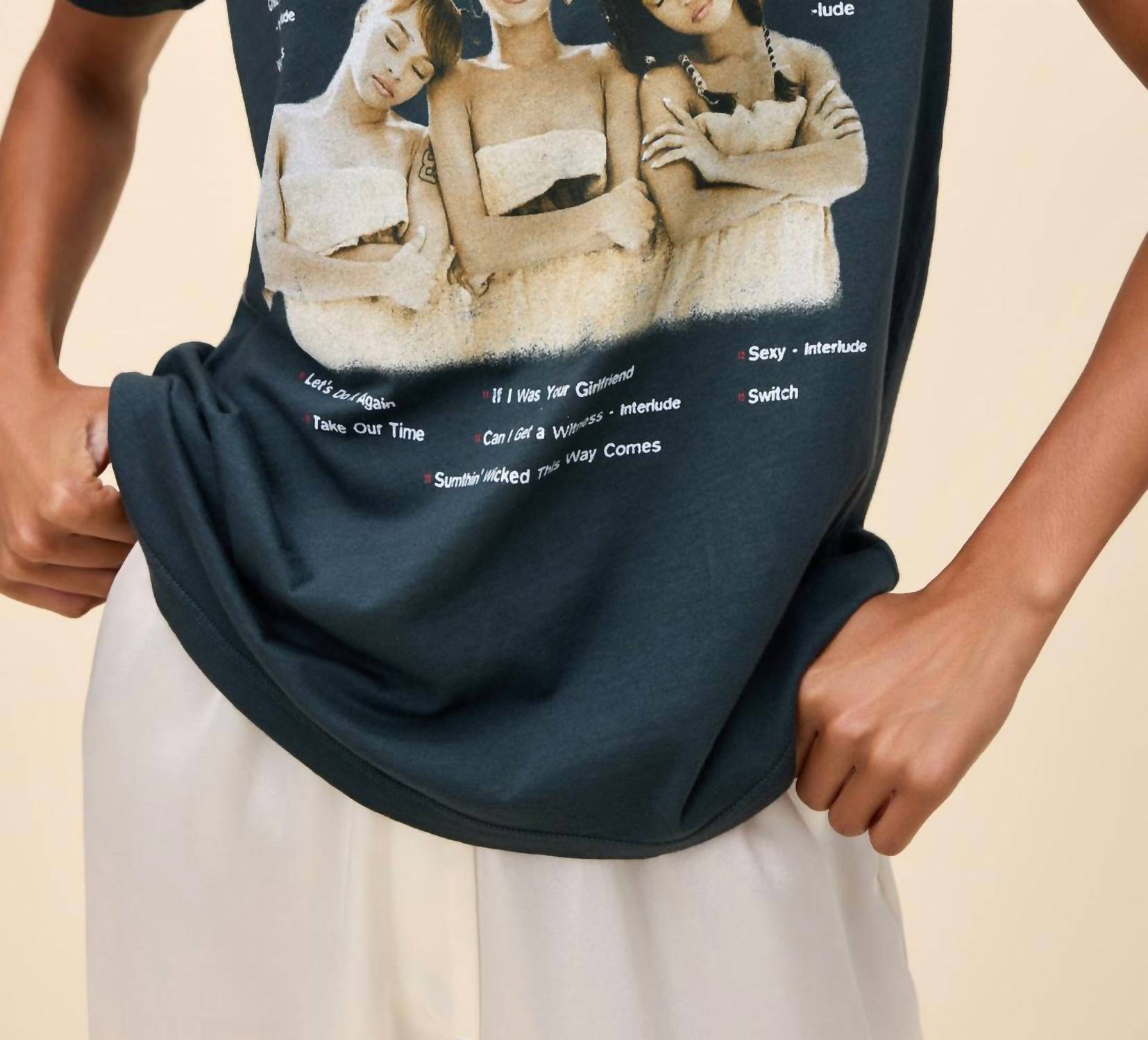 Celebrate the iconic 90s girl group with the TLC Track List Encore Tee by DAYDREAMER. Crafted from soft cotton, this navy blue tee features a striking graphic of TLC’s top tracks surrounding their portrait. Designed for women, this short sleeve shirt offers a classic crewneck and a convenient pull-on closure. Care for this piece by hand washing and laying it flat to dry, making it perfect for any streetwear or holiday party occasion.