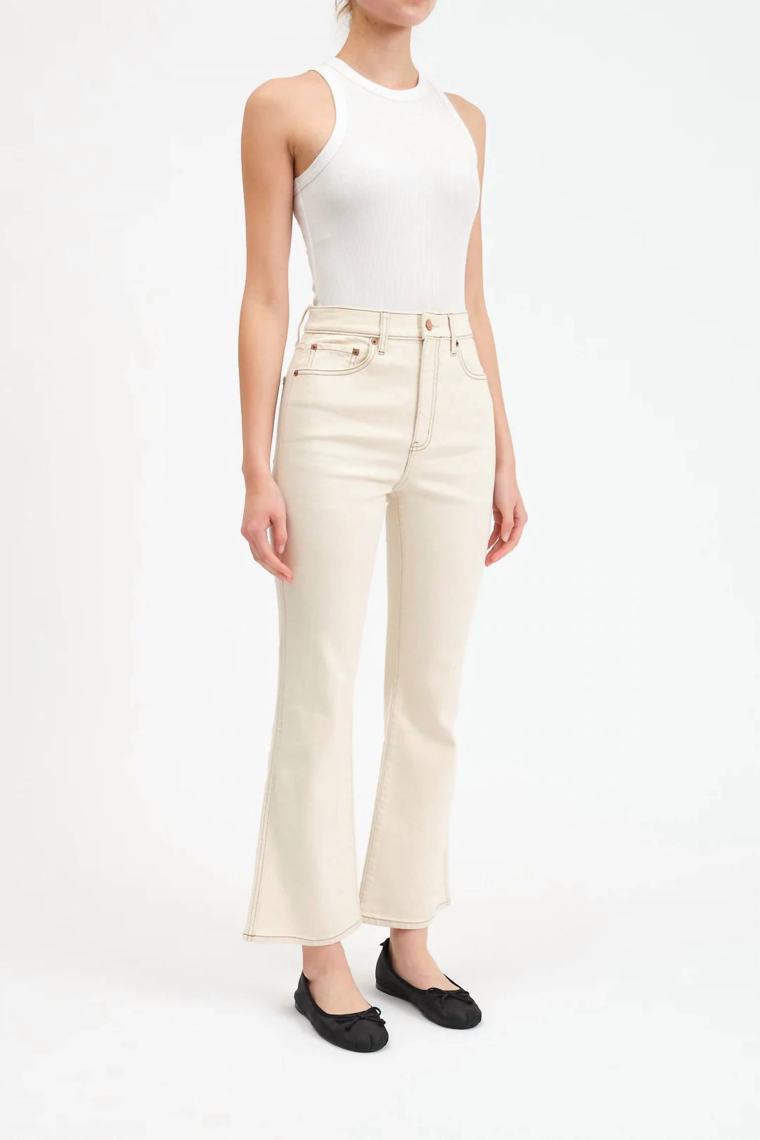 Introducing the Soho Rawcut High Rise Ankle Flare Jeans by DAZE, crafted in a stylish Oat Milk hue for women. These ankle-length jeans feature a relaxed, flared leg style with a high rise, 11 3/4-inch rise, 28 1/2-inch inseam, and an 18-inch leg opening, perfect for a day-to-night transformation. Made from a comfortable cotton blend of 64% cotton, 35% organic cotton, and 1% elastane, they provide the ideal combination of rigidity and stretch. Closure is secured with a hook and eye, and care is conveniently simple with machine wash instructions, aligning with the trend of streetwear and suitable for occasions like concerts and Easter celebrations.