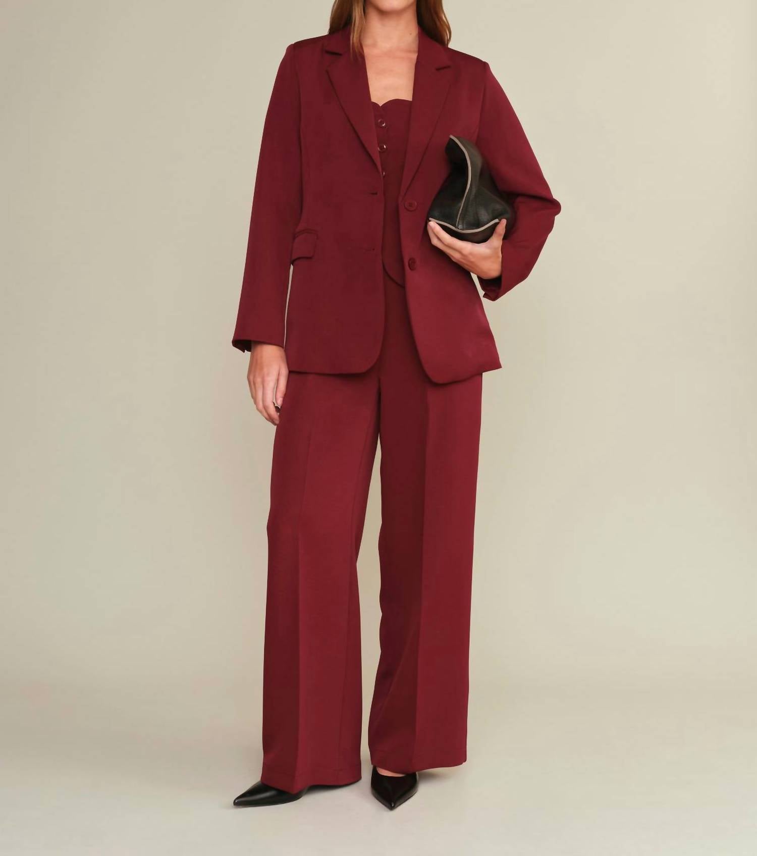 Introducing the Deluc Alex Dress Pants in a striking burgundy that elevates your wardrobe with sophistication and style. Crafted from high-quality polyester, these women's straight-leg pants feature a mid-rise waist and a zip closure for a comfortable and secure fit. Designed with a regular fit and equipped with pockets, they offer practical elegance perfect for Valentine's Day dinners or any Spring occasion.