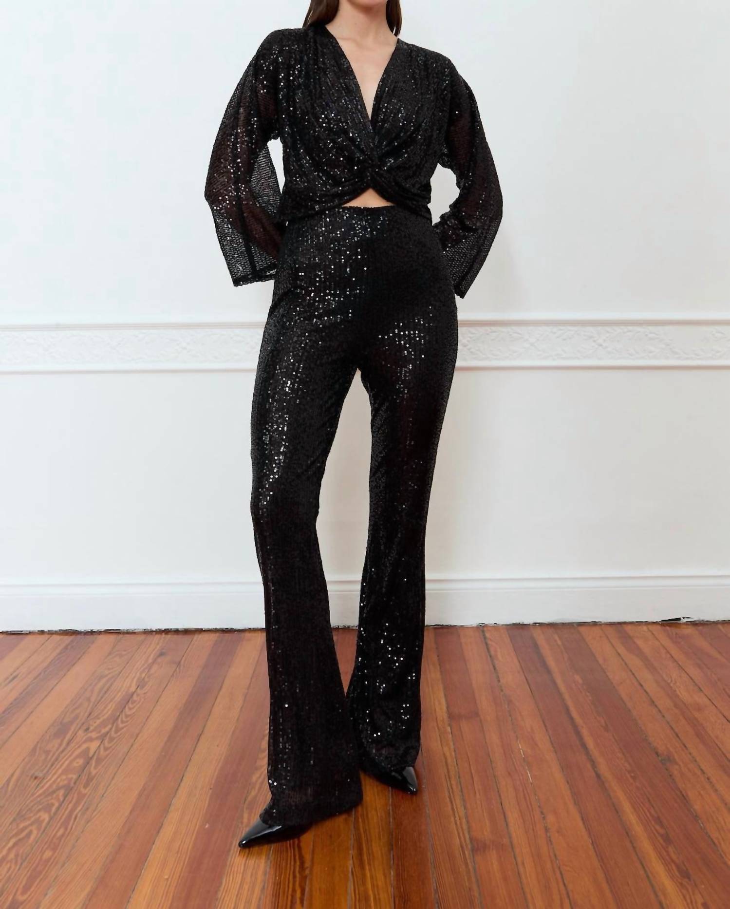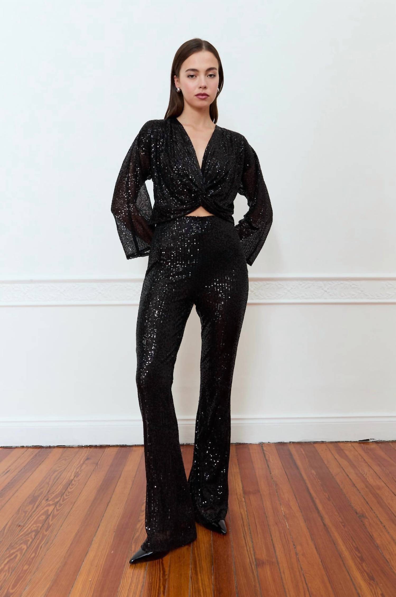 Uma blusa atemporal que nunca sai de moda. Blusa preta deslumbrante e cativante. Apresenta um elegante decote em V e mangas longas, adornada com lantejoulas brilhantes para um toque glamouroso. Confeccionada em 100% poliéster. Possui fecho de pressão para facilitar o uso. Lave com água fria e deixe secar na horizontal para manter o brilho.