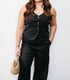 Introducing the Deluc Button Up Vest, a modern take on classic suiting, perfect for your spring wardrobe. This women's sleeveless vest is crafted from a Tencel blend, comprising 64% Tencel, 30% Viscose, and 6% Polyamide, offering a solid black hue. It features a stylish U neckline, true-to-size fit, sleek faux welt pockets, and is fully lined for a structured appearance. The marbled buttons add a refined finish with a button front closure, while care instructions suggest hand washing and laying flat to dry for optimal maintenance.