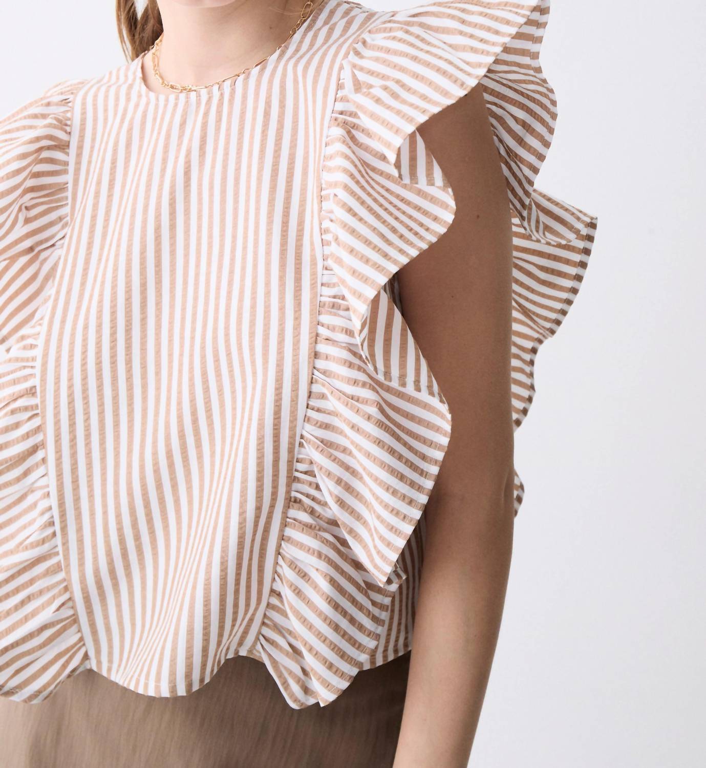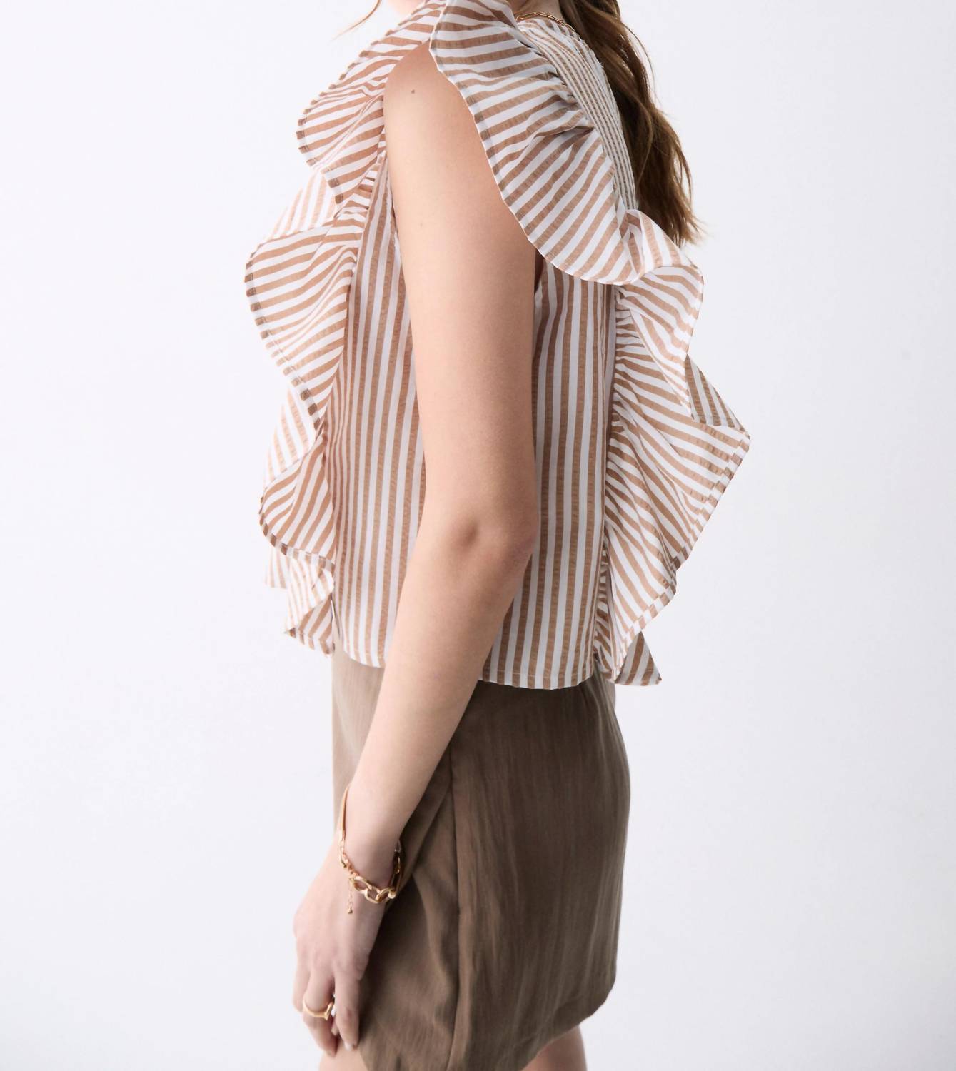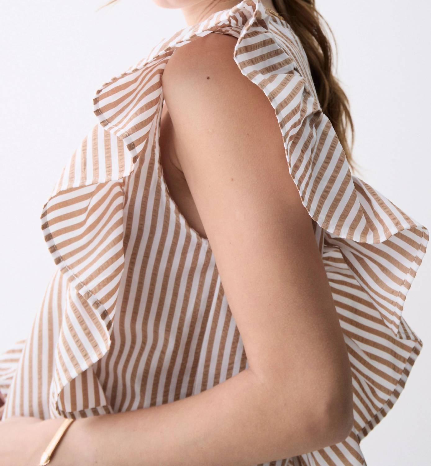 Combine isso com seus jeans e chinelos favoritos para sua próxima noite entre amigas. Eleve seu estilo com o Top Cesar DELUC, uma peça atemporal em bege listrado que adiciona um toque de sofisticação a qualquer guarda-roupa. Esta blusa xadrez é confeccionada em uma confortável mistura de algodão, com mangas curtas e uma elegante gola redonda. Os babados nas laterais, tanto na frente quanto nas costas, realçam seu toque feminino, complementados por um delicado fecho de botão na parte de trás do pescoço. Para um cuidado ideal, lave à mão e deixe secar na horizontal. A modelo mede 1,75 m e veste tamanho P.