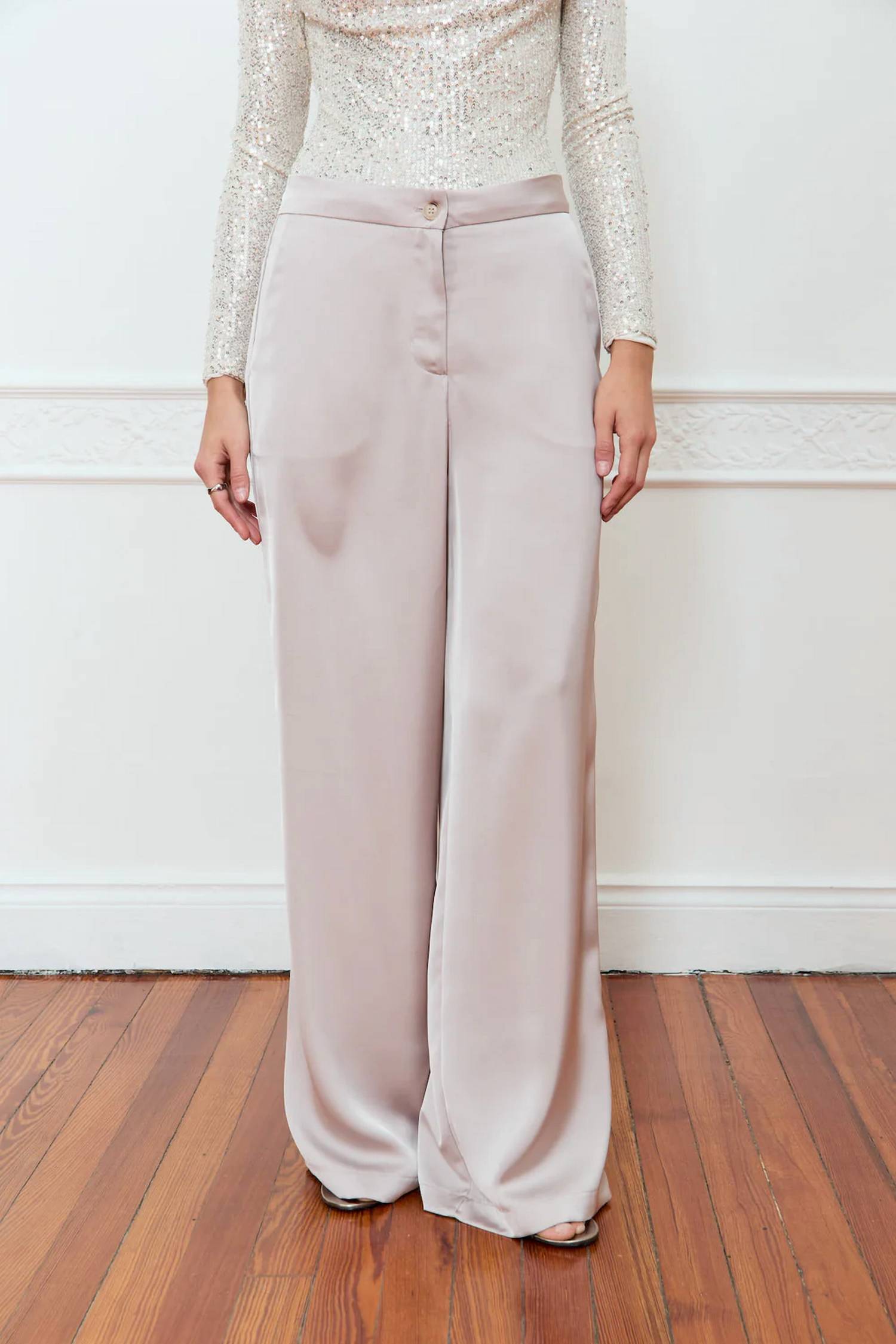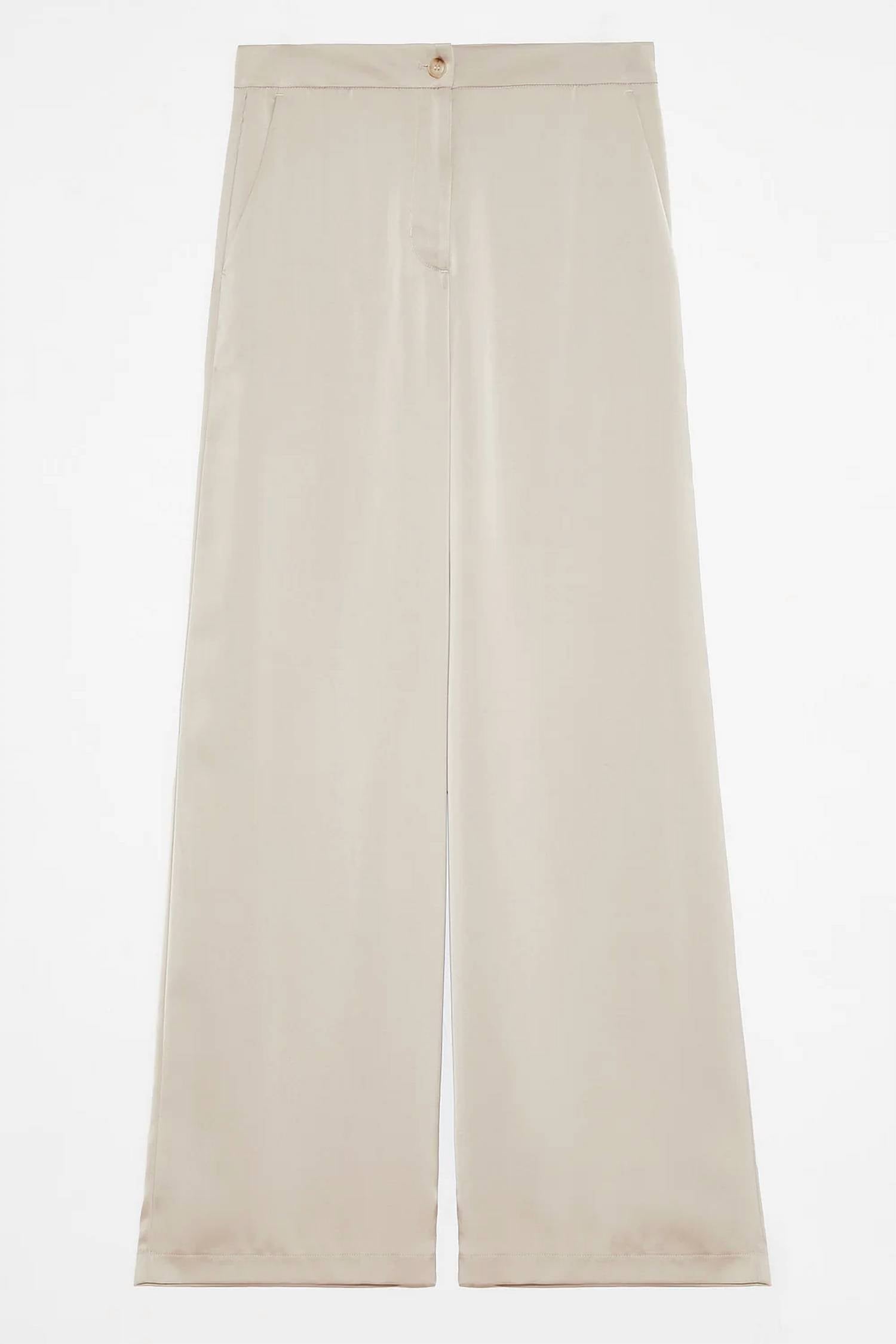 Projetado para um visual sofisticado e sedoso, em um deslumbrante tom perolado. Confeccionado com pernas largas e caimento solto. Proporciona estilo e conforto com seu luxuoso material acetinado. O design de cintura alta e o fecho por botões criam uma silhueta elegante. Lavar somente a seco.