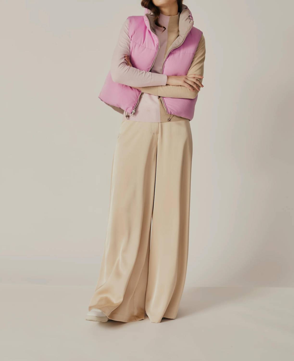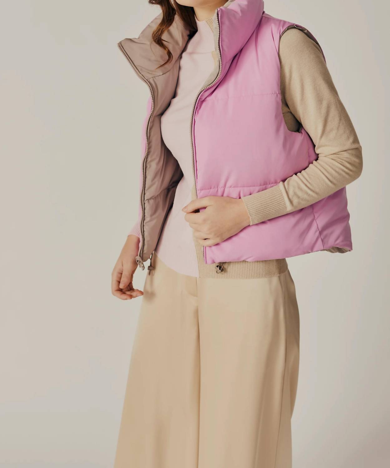 Aquela peça extra que você não sabia que precisava! Apresentamos o Colete Puffer Reversível Kansas da DELUC, uma peça essencial para o seu guarda-roupa de inverno em uma cor sólida rosa/vison marcante. Este colete feminino sem mangas oferece gola alta, caimento solto e bolsos frontais embutidos. Confeccionado em tecido sintético, possui um prático fecho frontal com zíper e bainha ajustável com cordão elástico e travas para um ajuste personalizado. Perfeito para as festas de fim de ano, este colete versátil mantém você aquecido com estilo.