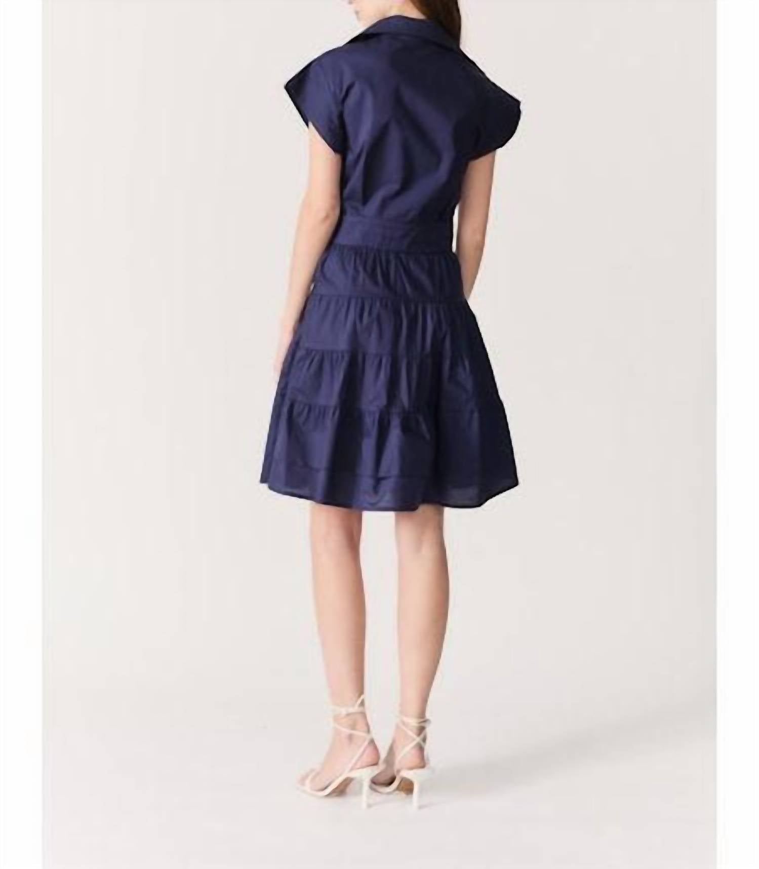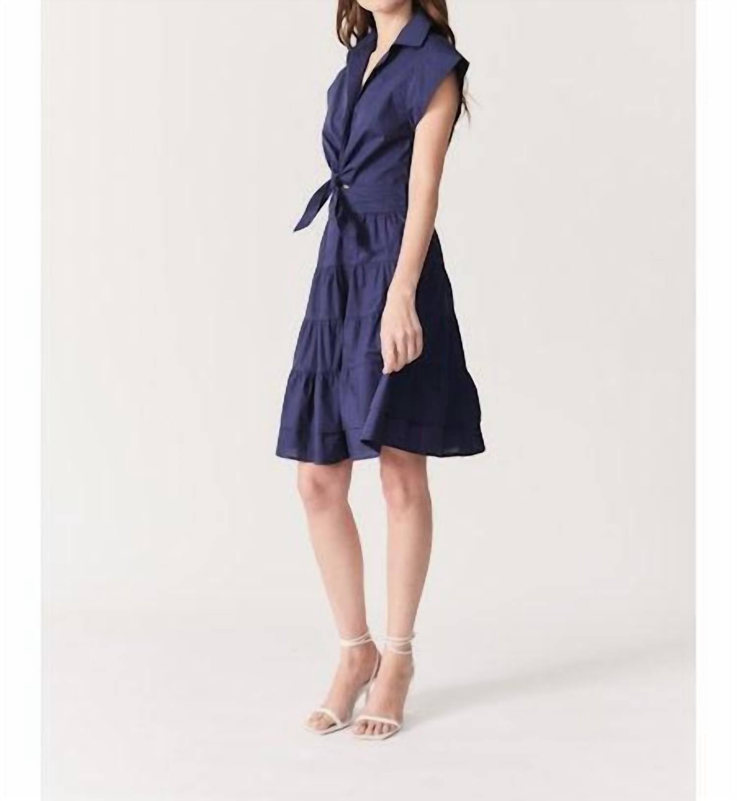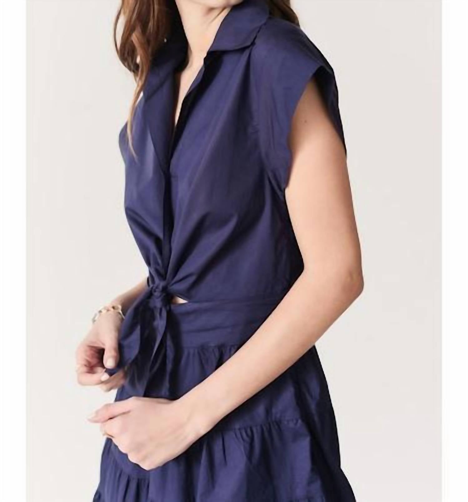 Meet the Murillo Mini Dress by DELUC, a chic addition to your spring wardrobe in Blue Marine. This sleeveless, 100% cotton piece showcases a collared V-neck and a flattering knot detail at the waist, transitioning into a ruffled skirt. The dress features a front button and side hidden zip closure for ease and elegance. Machine washable for convenience, it's both stylish and perfect for a New Year's Eve dinner party. Model is 175cm / 5'9" and is wearing a size S.
