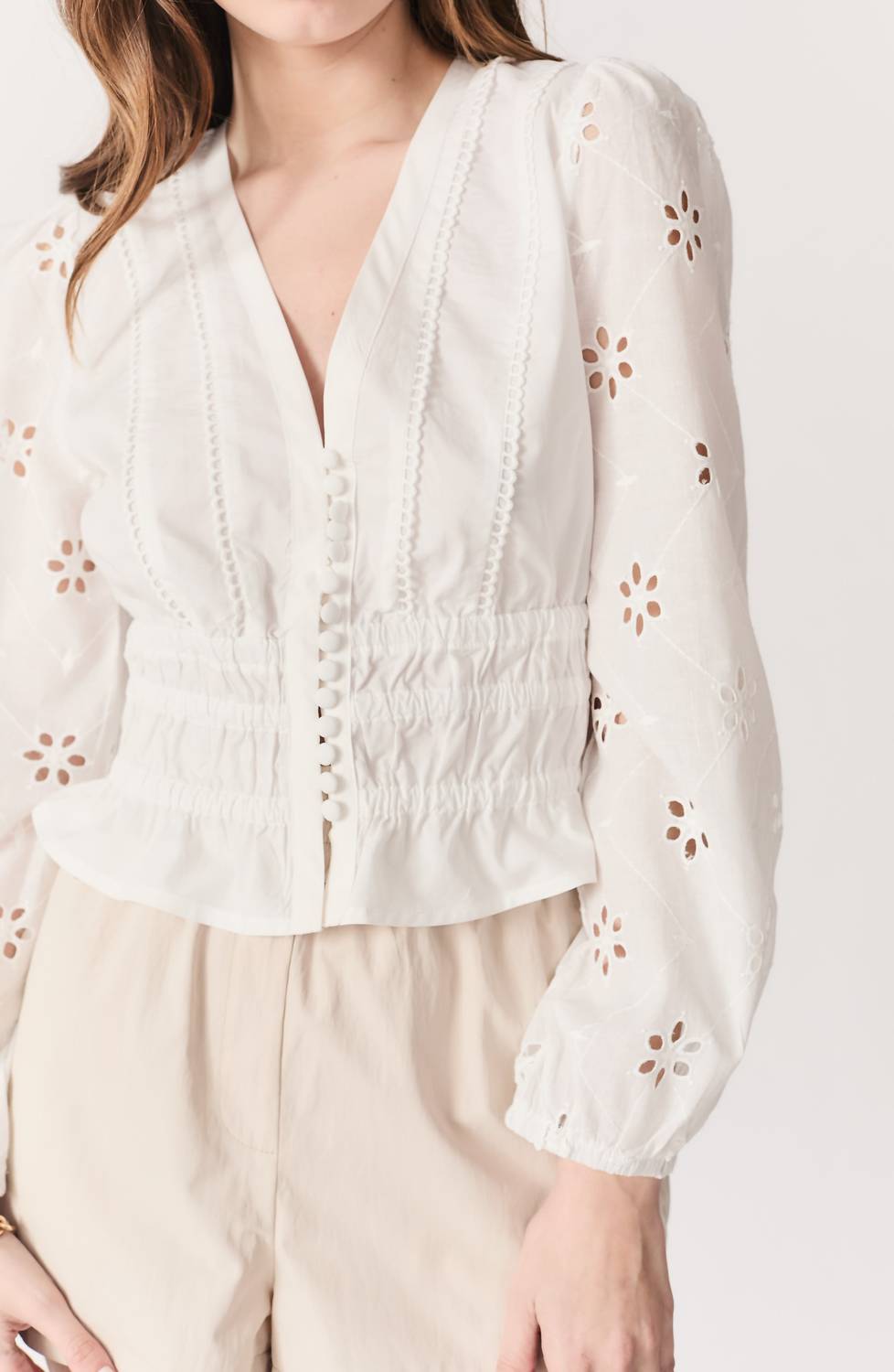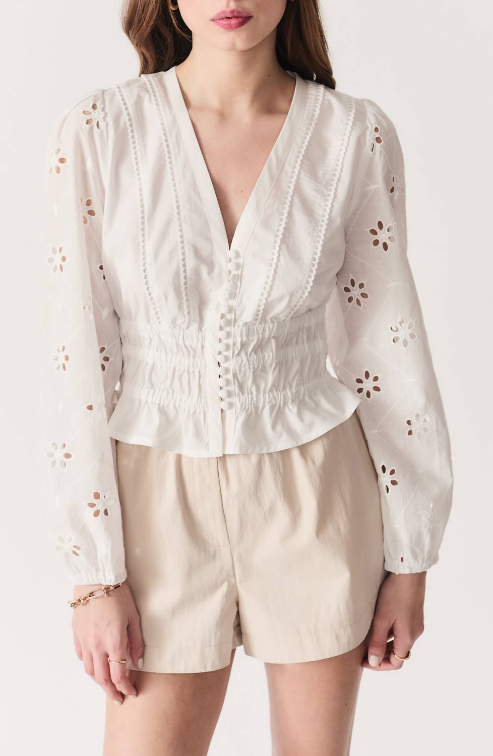 Conheça o Top Oleiros da Dèluc, uma peça chique criada para mulheres que amam a elegância minimalista. Este top branco estampado possui mangas compridas com delicados detalhes em ilhós e punhos elásticos para facilitar o styling. Confeccionado em 100% algodão, é perfeito para um jantar de verão com seu elegante decote em V e cintura marcada, proporcionando um visual elegante sem complicações. Fechamento: Botão.