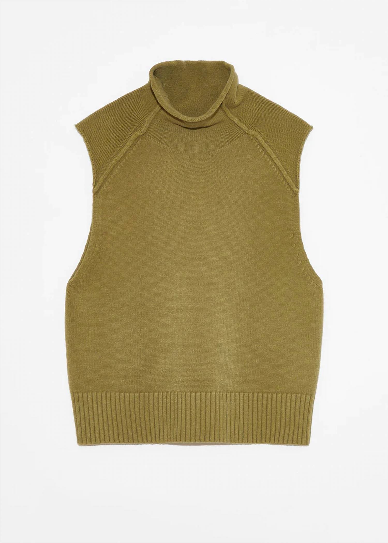 Um clássico essencial que todo guarda-roupa precisa. O colete de gola alta Penstemon Knit da DELUC é um item essencial para o outono, oferecendo uma combinação elegante de estilo e conforto. Confeccionado em viscose cáqui, este colete liso e sem mangas apresenta detalhes de costura visíveis na frente e nas costas. Com caimento solto e fecho pull-on, proporciona praticidade ao vestir, mantendo um visual sofisticado. Instruções de cuidado não são fornecidas; no entanto, esta peça versátil é perfeita para usar em camadas ou sozinha.