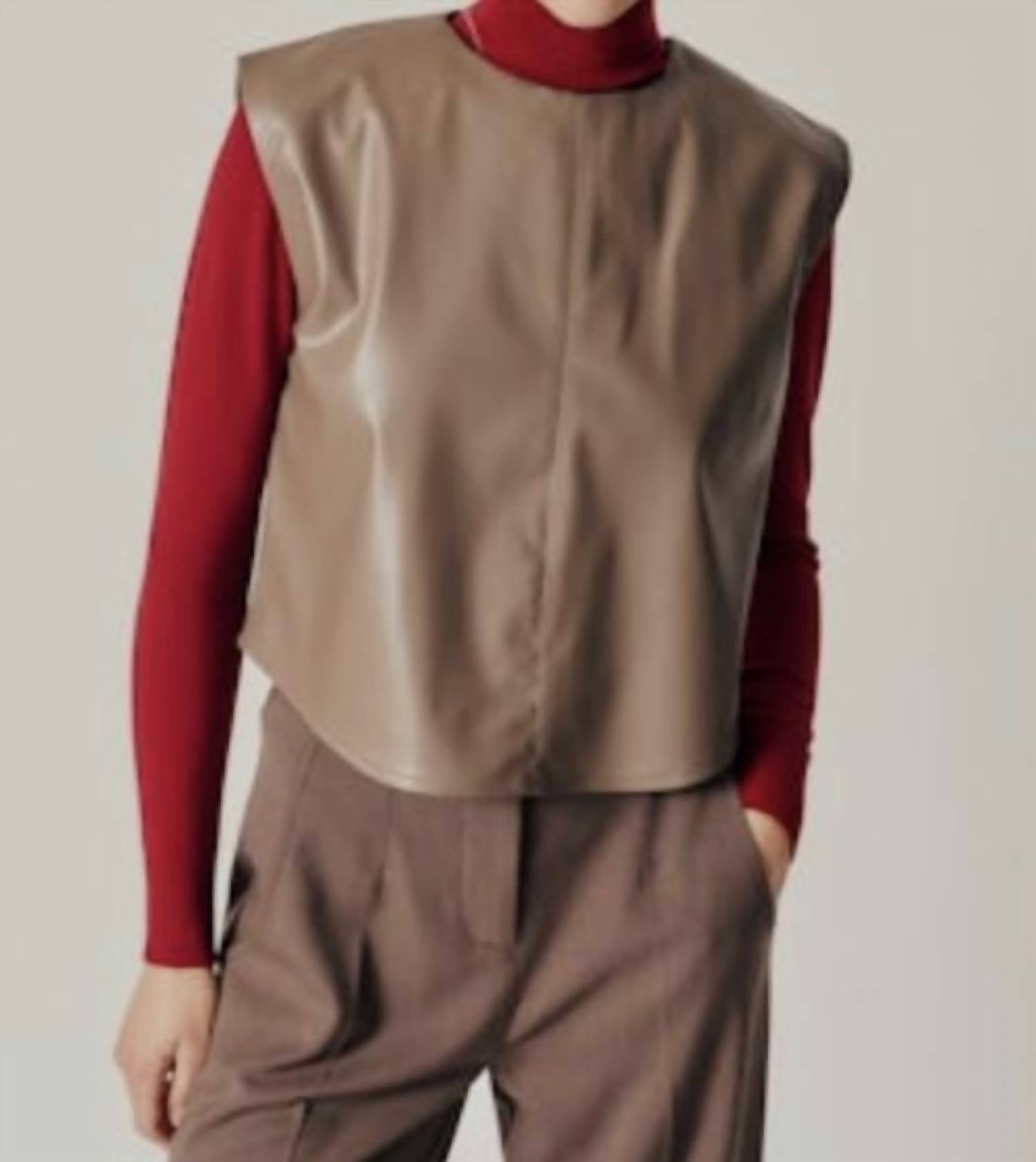 Uma blusa versátil que pode ser usada do escritório ao jantar! Apresentamos o Top Picea da Dèluc, uma blusa sofisticada confeccionada em um tom taupe atemporal. Este top feminino é sem mangas e tem um design elegante de gola redonda, proporcionando um visual elegante e moderno. Feito em couro de alta qualidade, garante um acabamento luxuoso com durabilidade. O fecho de zíper adiciona um toque contemporâneo, tornando-o um complemento ideal para qualquer guarda-roupa chique.