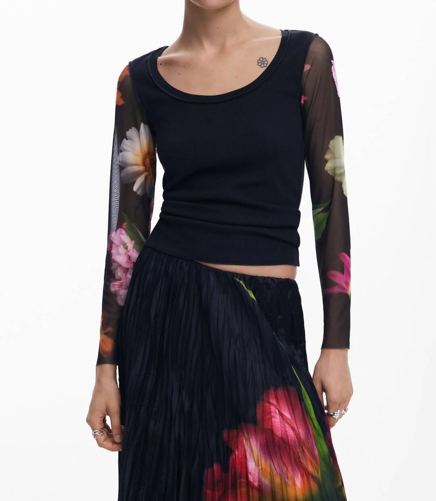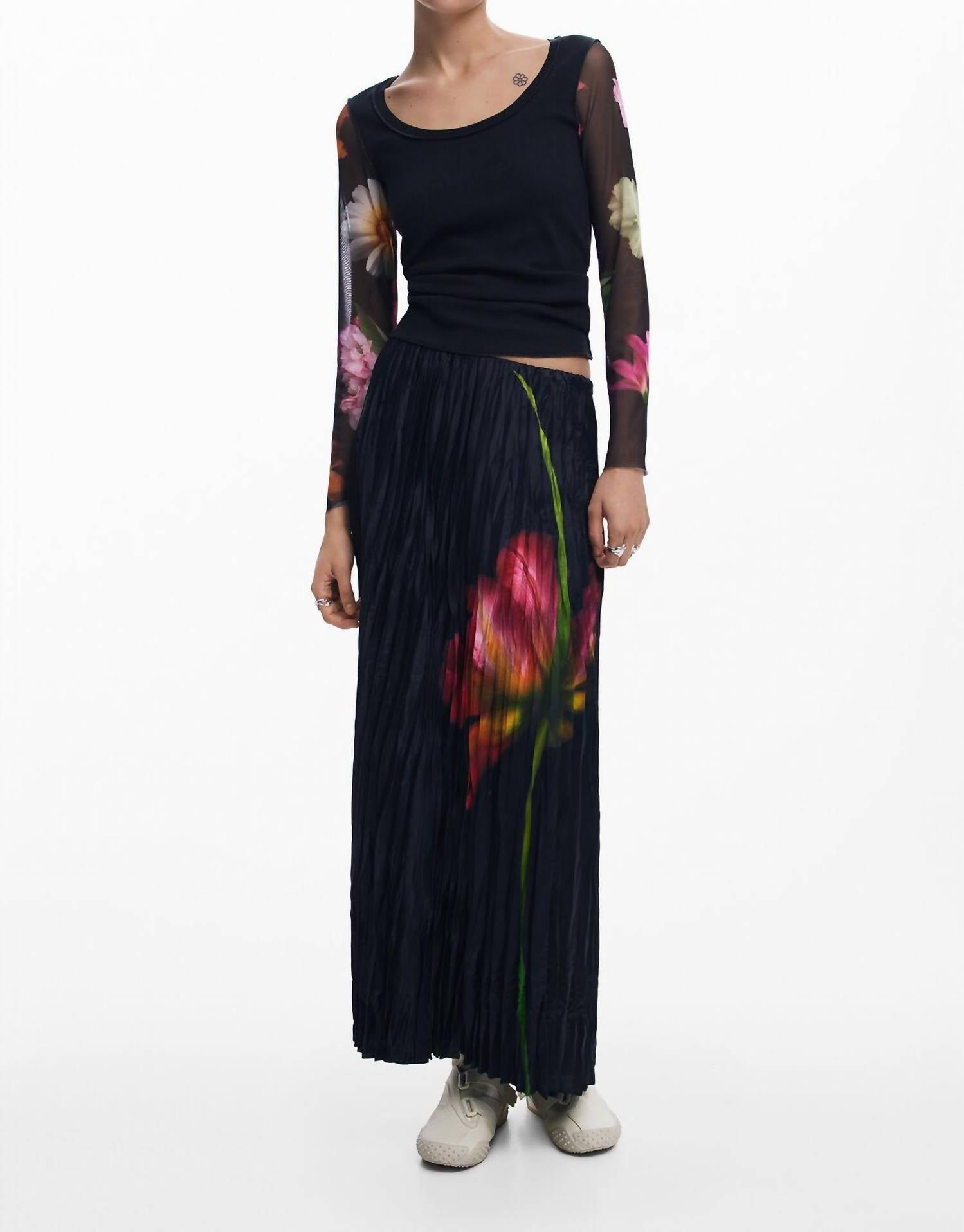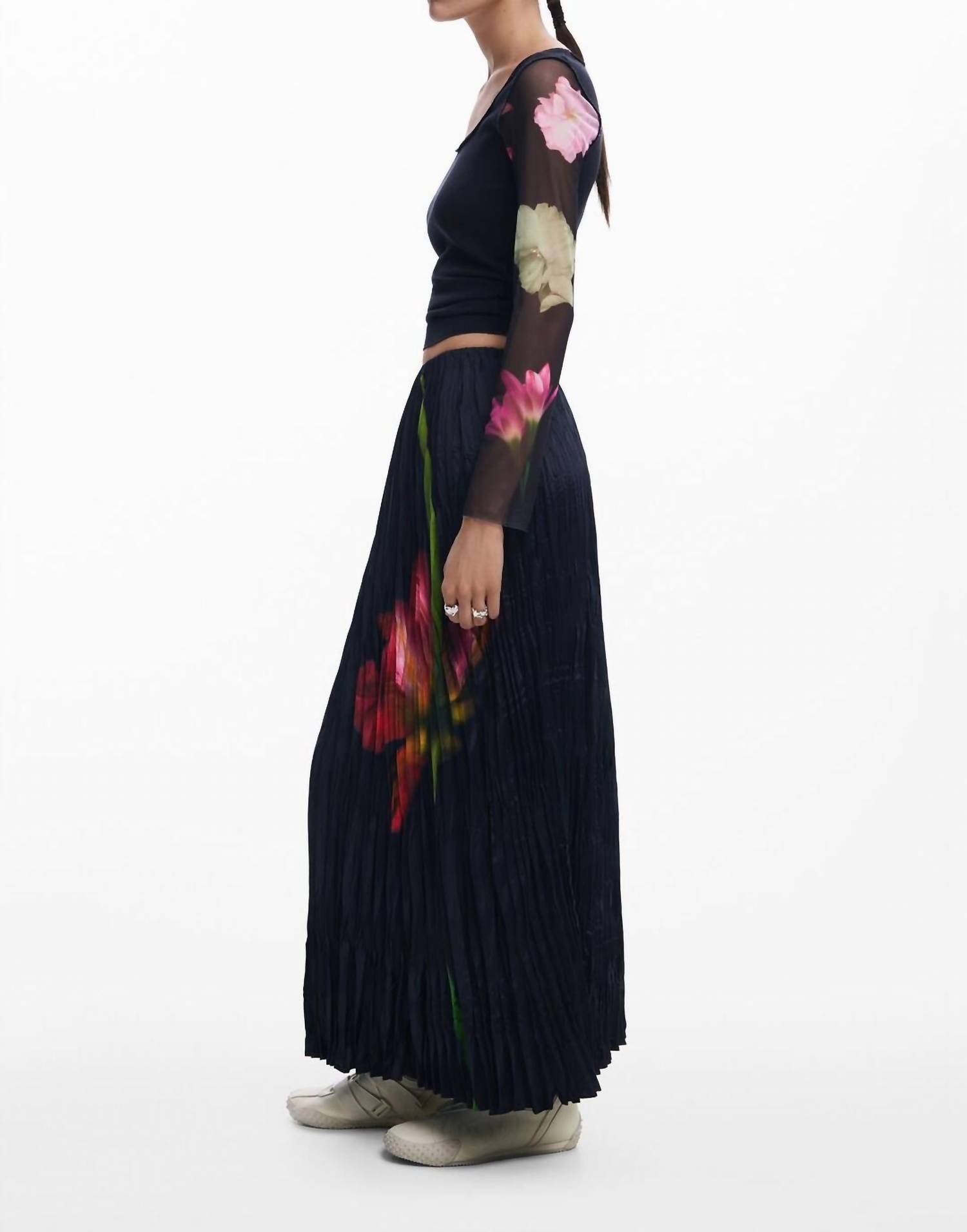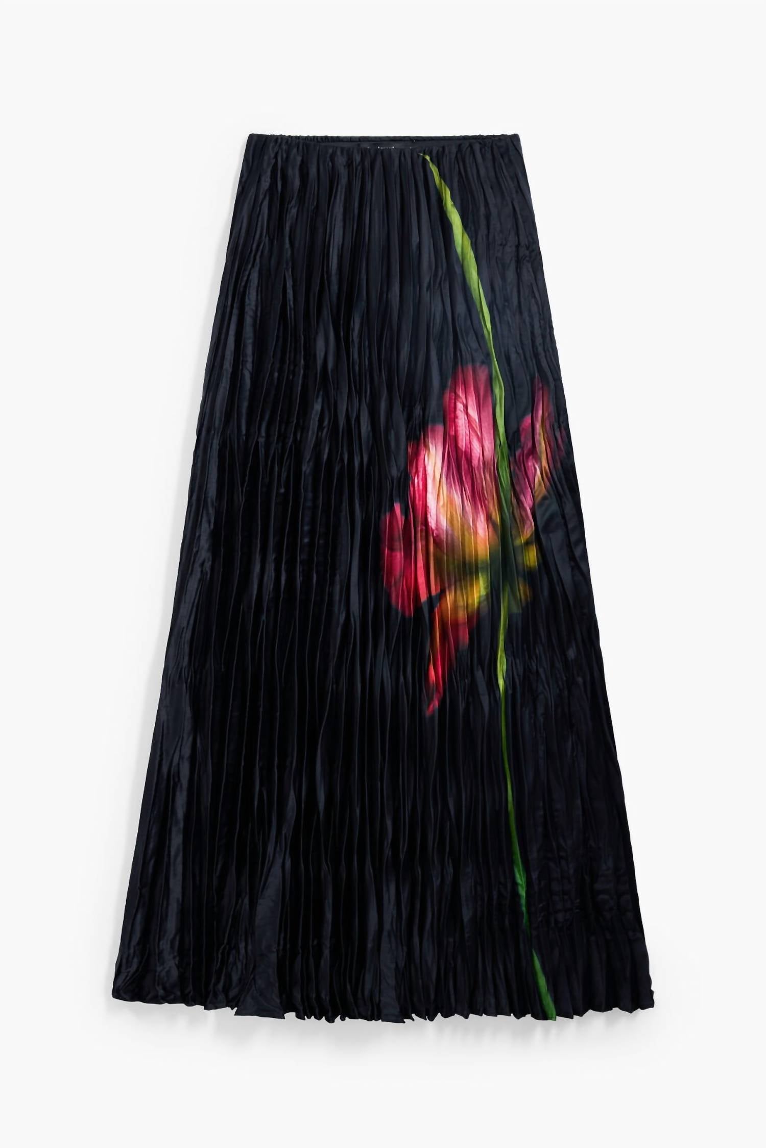 Saia longa com efeito plissado e franzido, cós elástico liso com estampa floral.