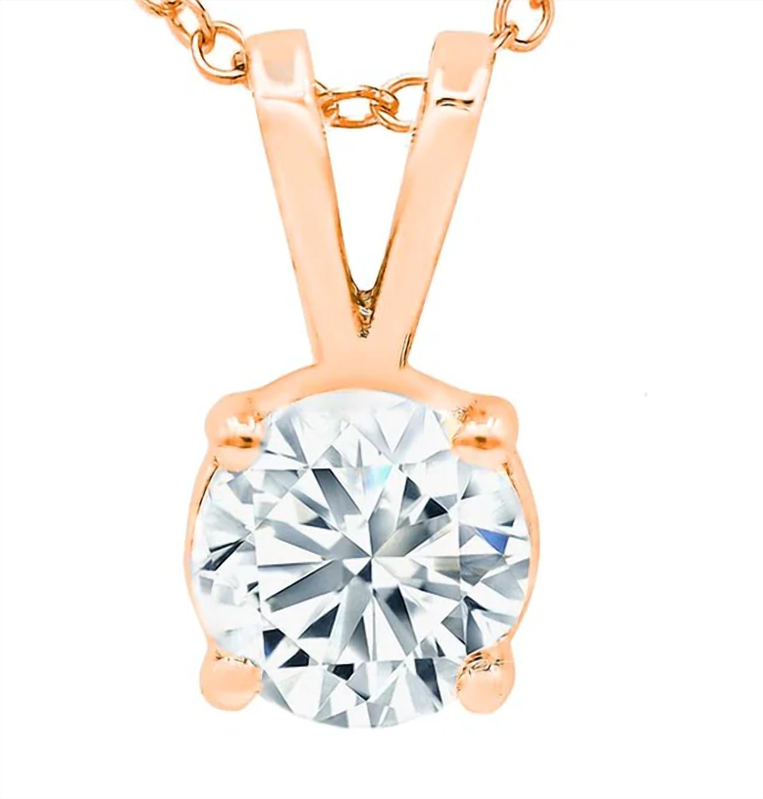Elevate your elegance with the 14kt 0.75 Cts Fine Lab Grown Diamond Solitaire Pendant Necklace by Diana M Jewels. This exquisite piece features a 0.75 carat lab-grown diamond in a round brilliant shape, secured in a 3-prong setting with a rabbit ear bail. The diamond boasts DEF color and VS clarity, ensuring an excellent cut that sparkles with brilliance. Crafted from 14k rose gold, this stunning necklace includes a 16" chain, making it the perfect fine jewelry addition for April birthstones or any sophisticated occasion.