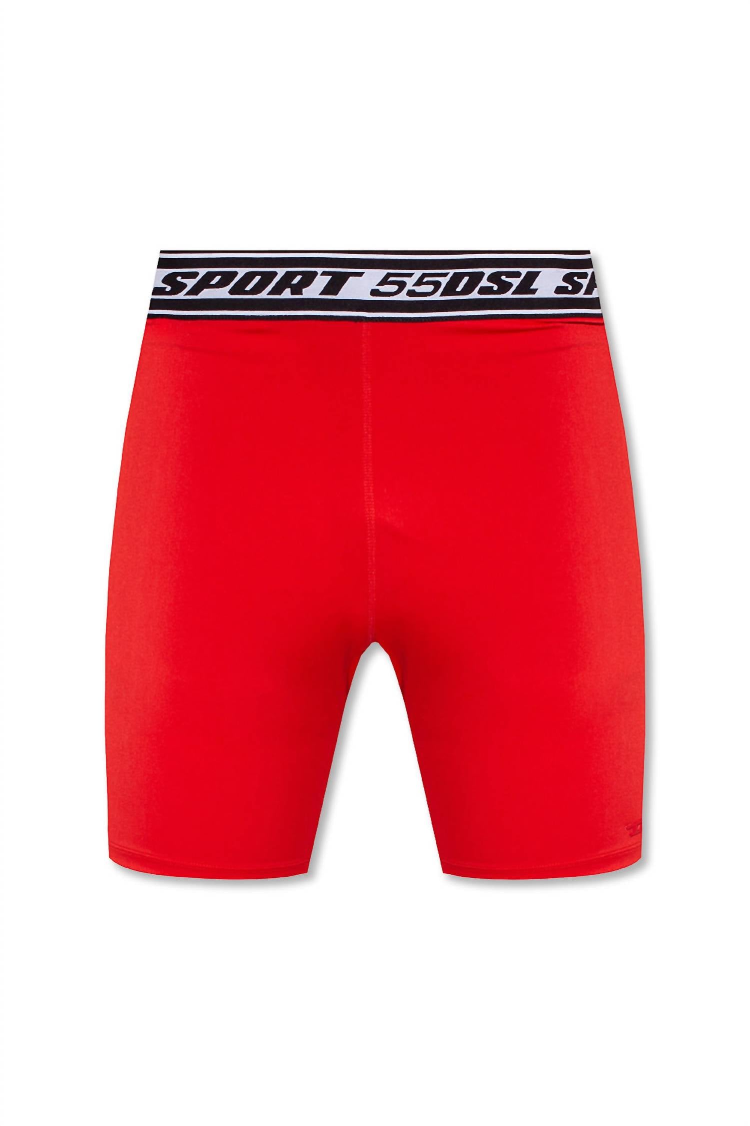 Introducing the DIESEL Sport Sprant Bike Shorts from the ATHLEISURE collection, perfect for all your fitness and workout needs. Made with 58% Nylon and 42% Elastane, this high-performance pair of shorts is designed to keep you comfortable with UPF shielding and moisture-wicking abilities. These solid red shorts feature a pull-on closure and a logo-printed elastic waistband, enhanced by seamless flatlock stitching for a smooth feel. Stay on-trend this summer with these versatile, athletically styled essentials.