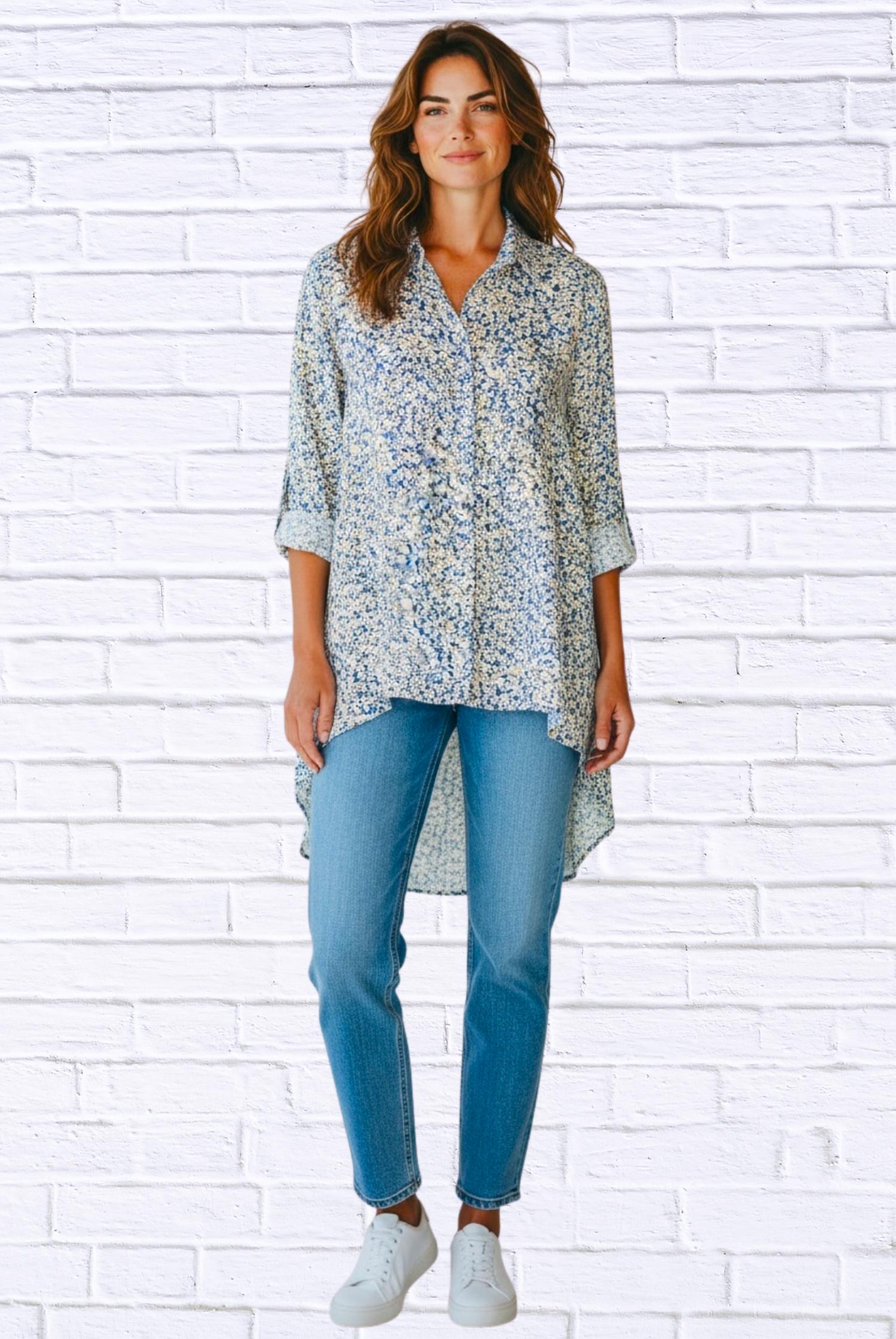 Introducing the Floral Viscose High-low Shirt by Diva USA, a timeless piece in Dusty Lavender with White Flowers for a touch of feminine elegance. This long sleeve blouse is made from 100% viscose, offering a breathable and flowy fit with a collared neckline and high-low hemline. Button closure. Dry clean.