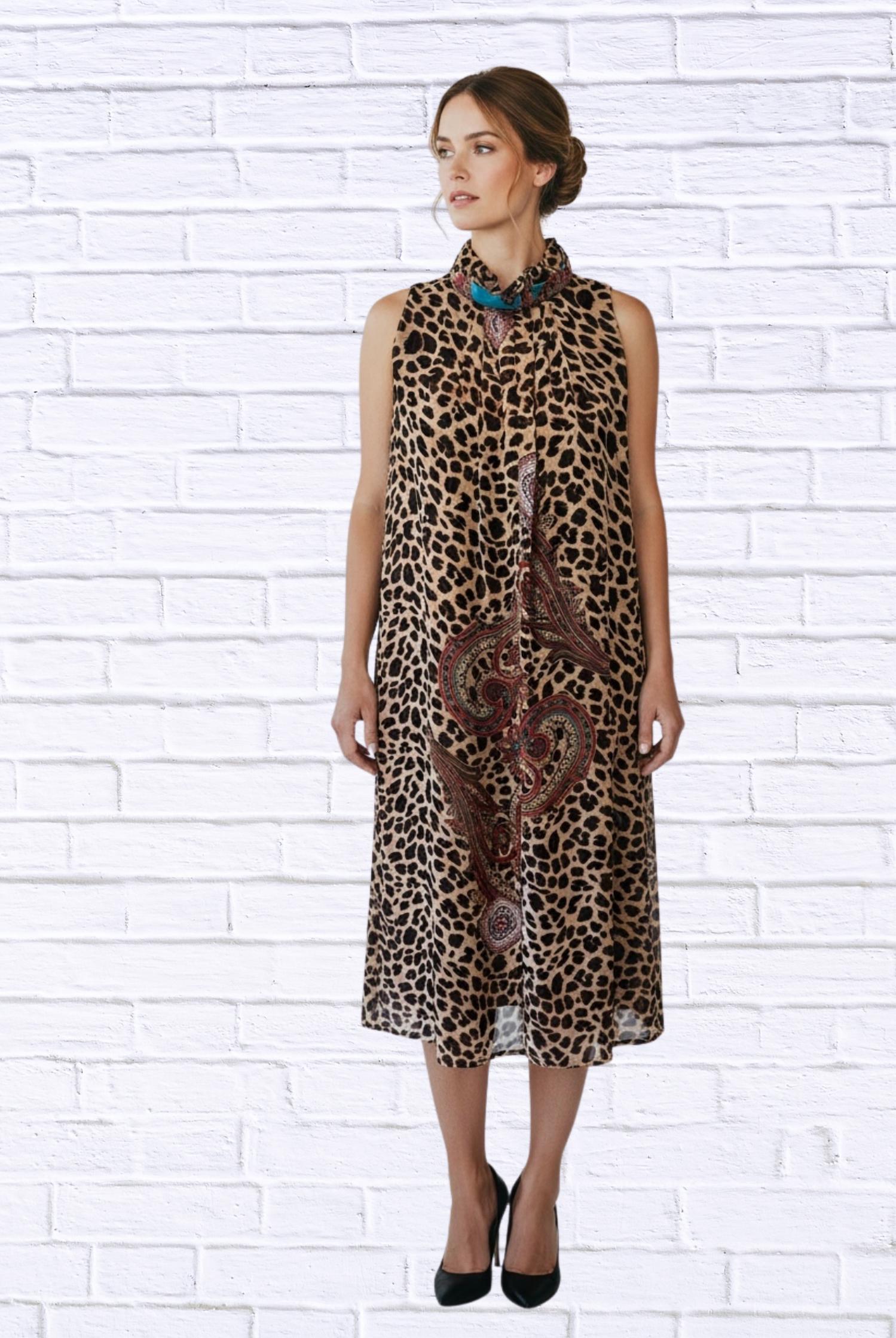 Just add slides or mules and you are good to go. Embrace a bold look with the Print Sleeveless Maxi Dress by Diva USA, a captivating piece designed for women. This maxi dress features a sleeveless cut and a high neckline with a feminine bow tie detail. Made from lightweight woven fabric, it boasts a striking animal and paisley mix print with bold red accents, exuding wild elegance. Machine wash.