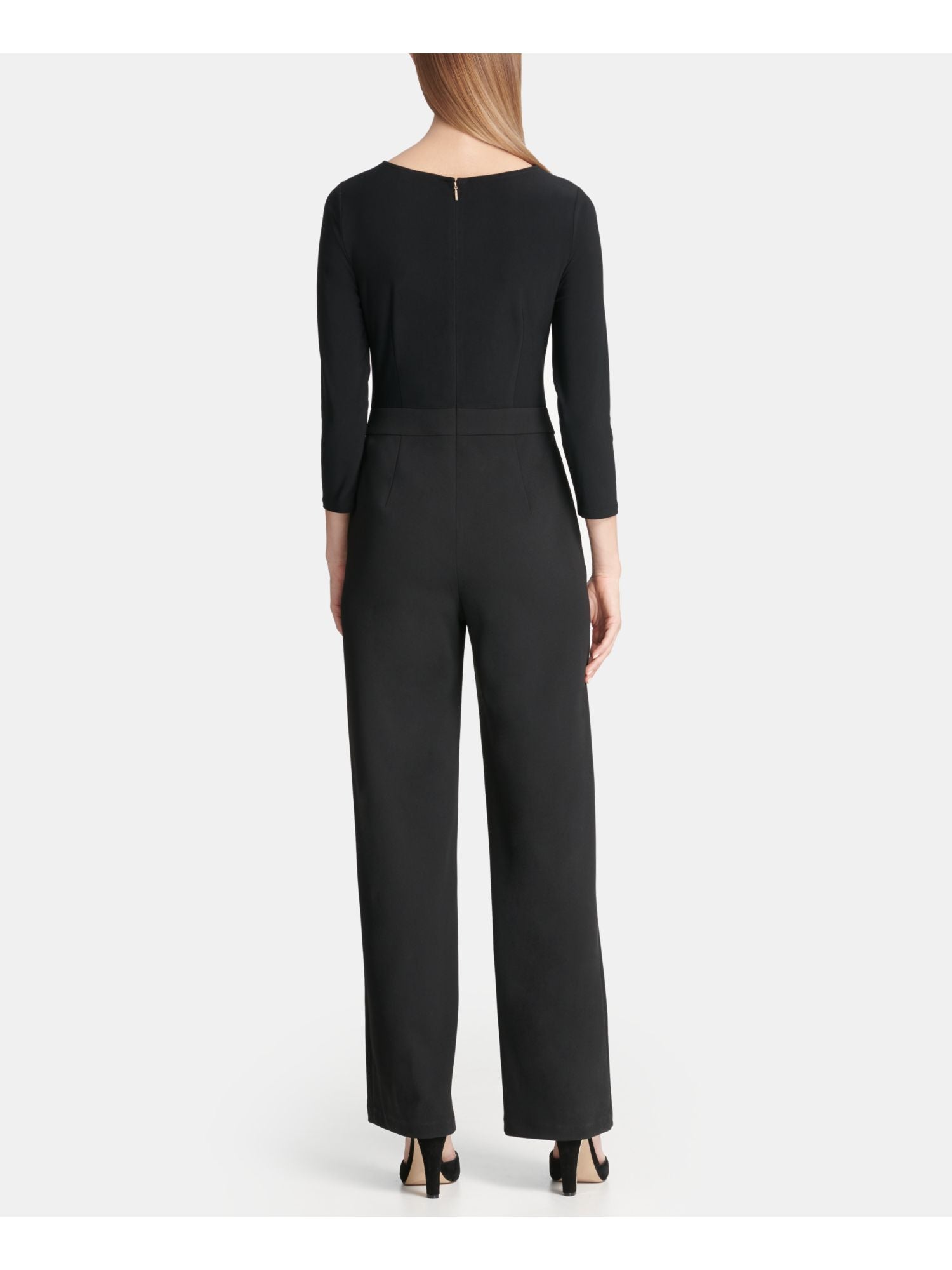 Macacão feminino DKNY com decote em joia e manga 3/4, perna reta, preto, tamanho 6