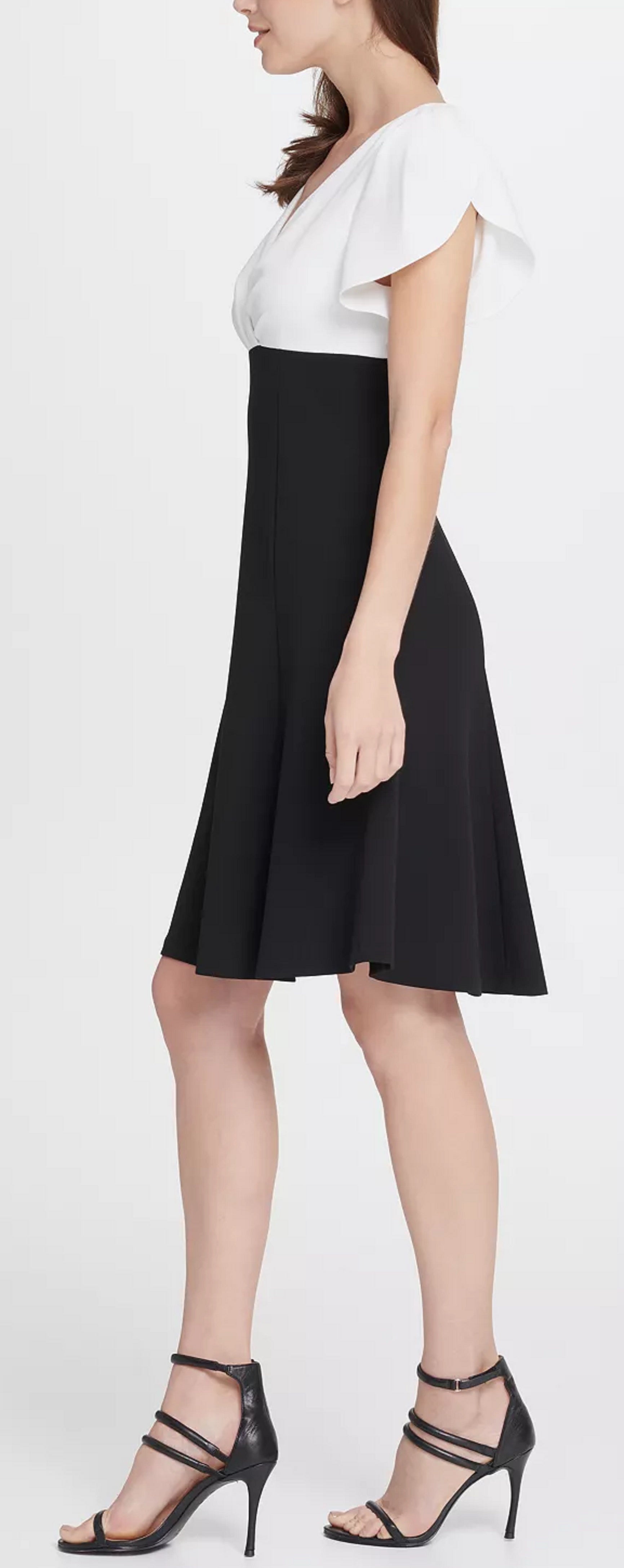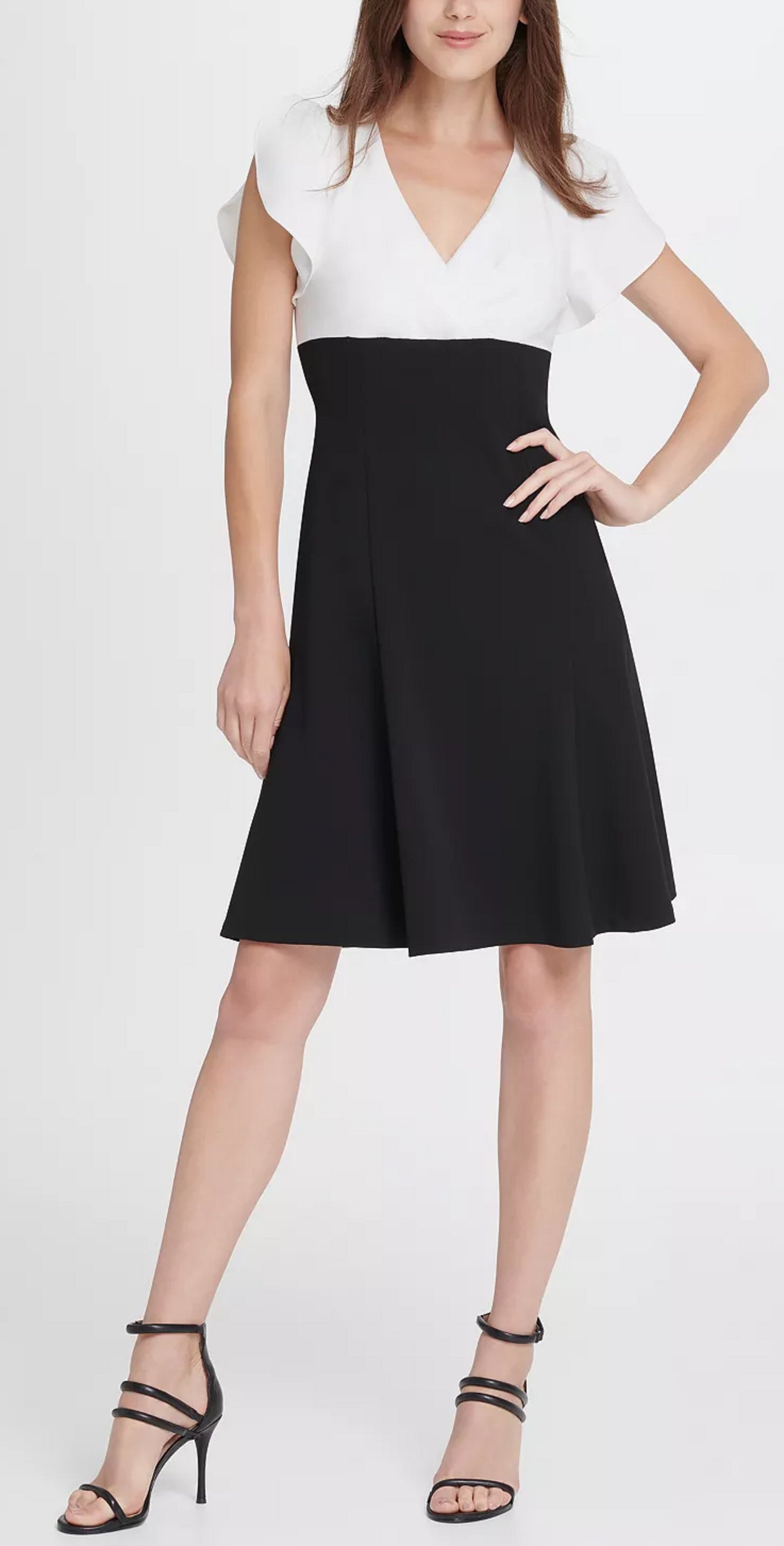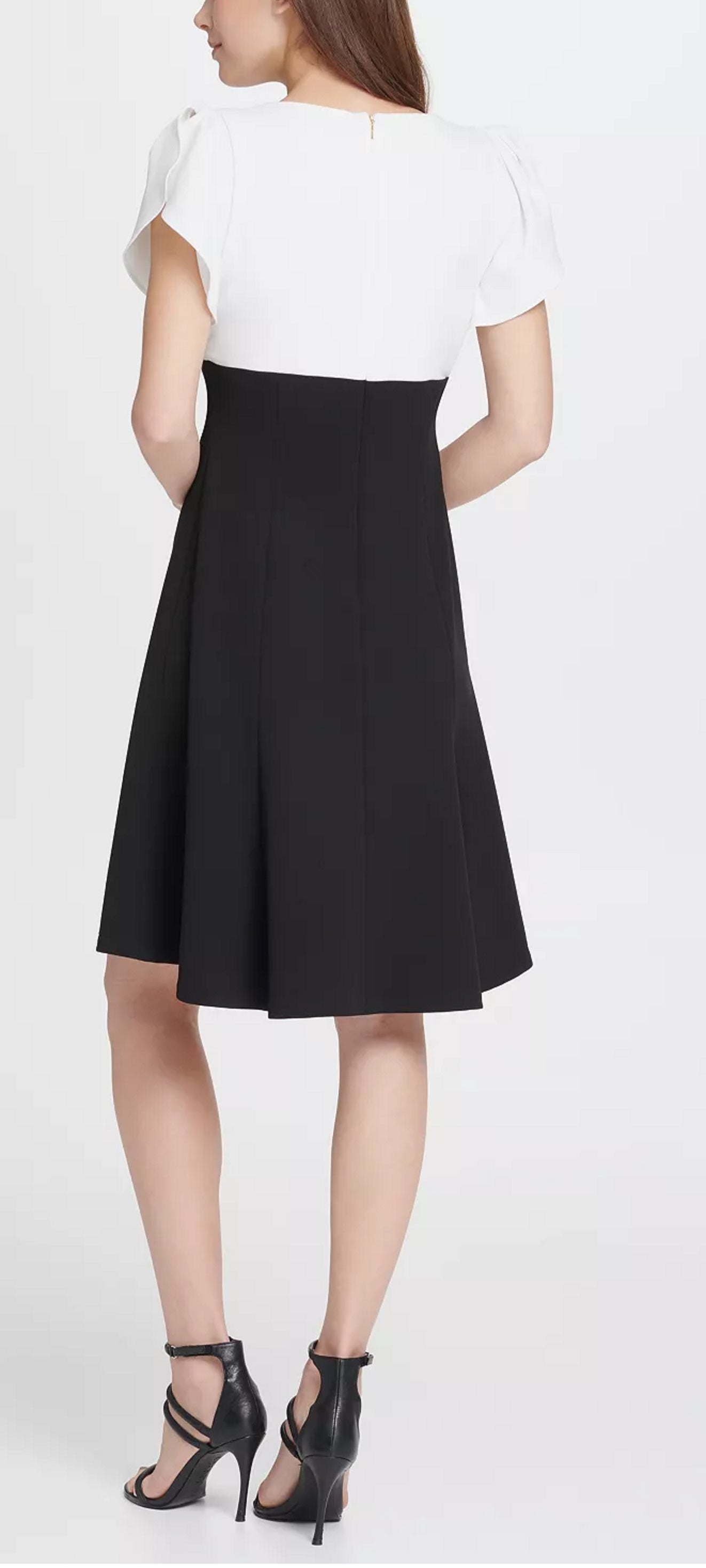Vestido flare feminino DKNY com manga tulipa e bloco de cores, preto/branco, tamanho 12