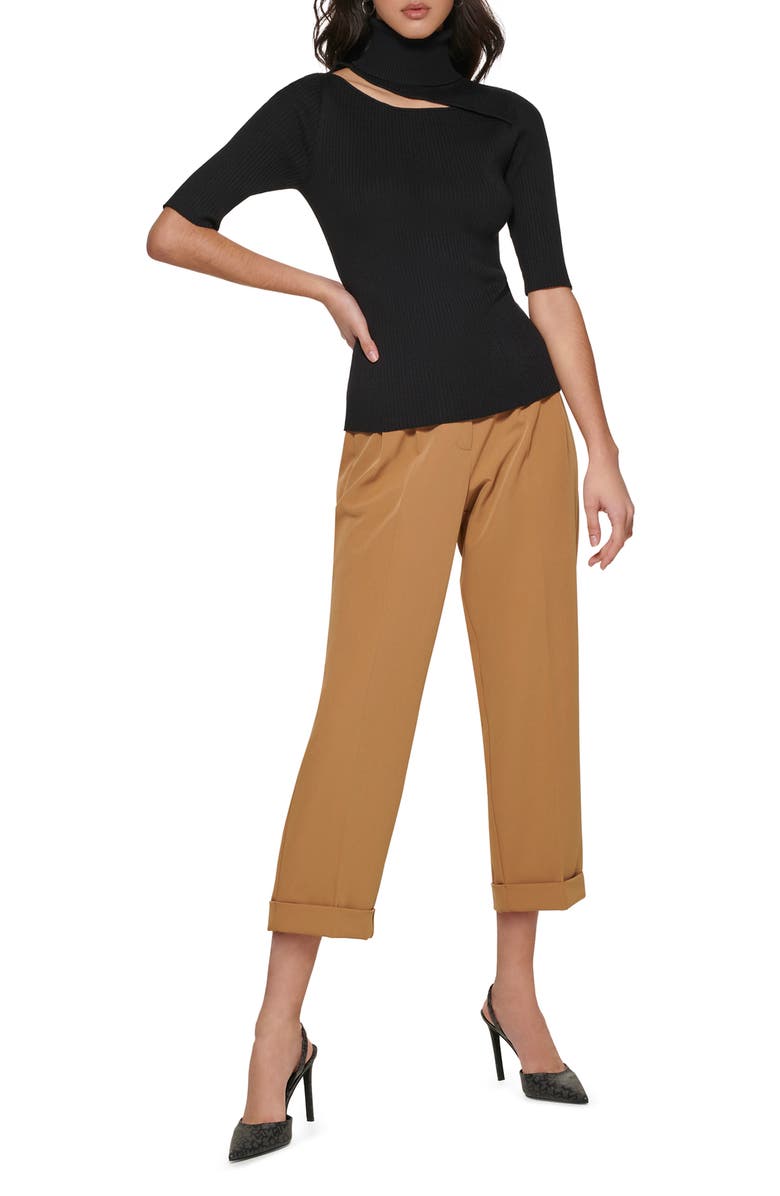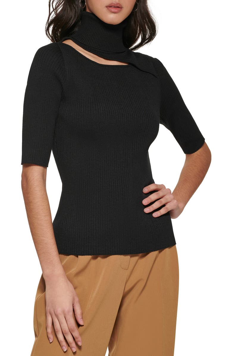 Suéter feminino DKNY com recorte na manga cotovelo e gola alta canelada, preto, tamanho médio