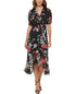 Os florais românticos e os delicados detalhes de babados da DKNY fazem deste vestido de mangas bufantes uma declaração de estilo para casamentos e outros eventos. | Forrado | Amarração na cintura; saia curta com babados | Importado | Fecho de zíper nas costas | Decote em V; silhueta midi | Mangas curtas bufantes