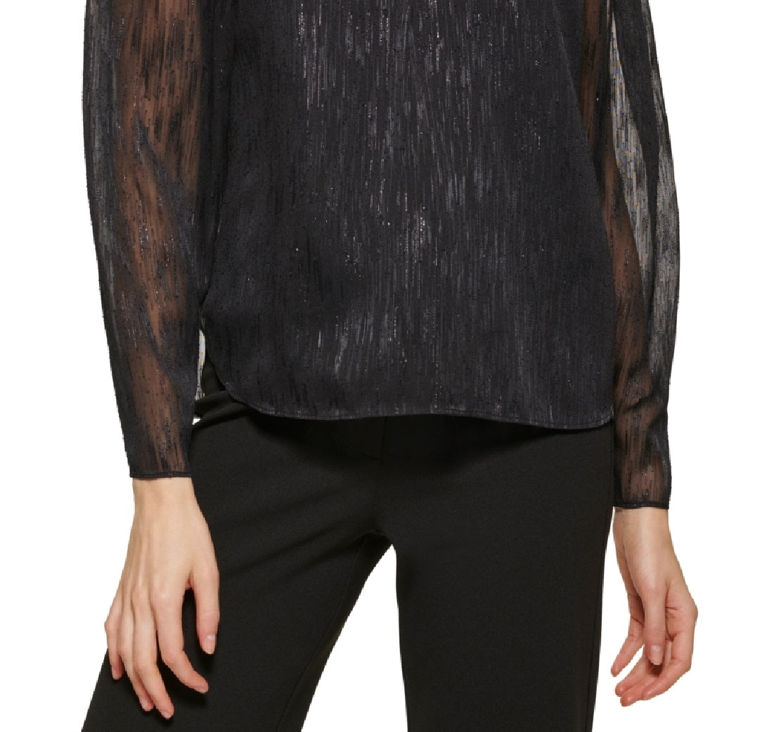 Blusa feminina metálica de manga comprida DKNY, preta, tamanho médio