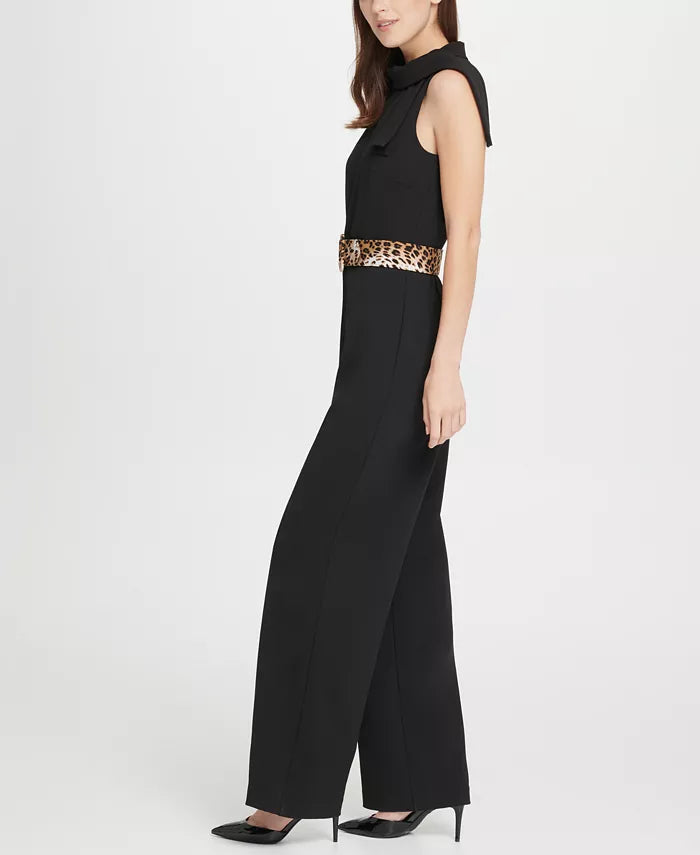 Macacão feminino DKNY com decote em V e cinto de leopardo, preto, tamanho 14