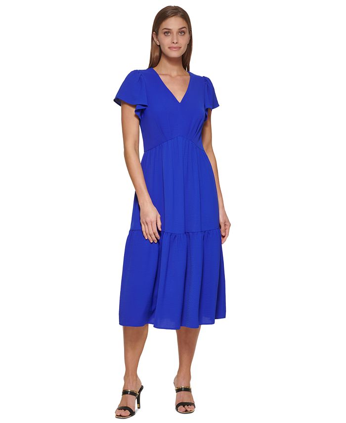 Com corte que se ajusta elegantemente ao corpo | este vestido DKNY petite com decote em V ostenta uma saia em camadas que promete elegância moderna a cada passo poético. | Aproximadamente 107,5 cm de comprimento, do centro do pescoço até a bainha. O comprimento é baseado no tamanho 6P e varia 1/4 entre os tamanhos | Cai abaixo do joelho até a panturrilha | Decote redondo; Silhueta midi | Zíper invisível nas costas