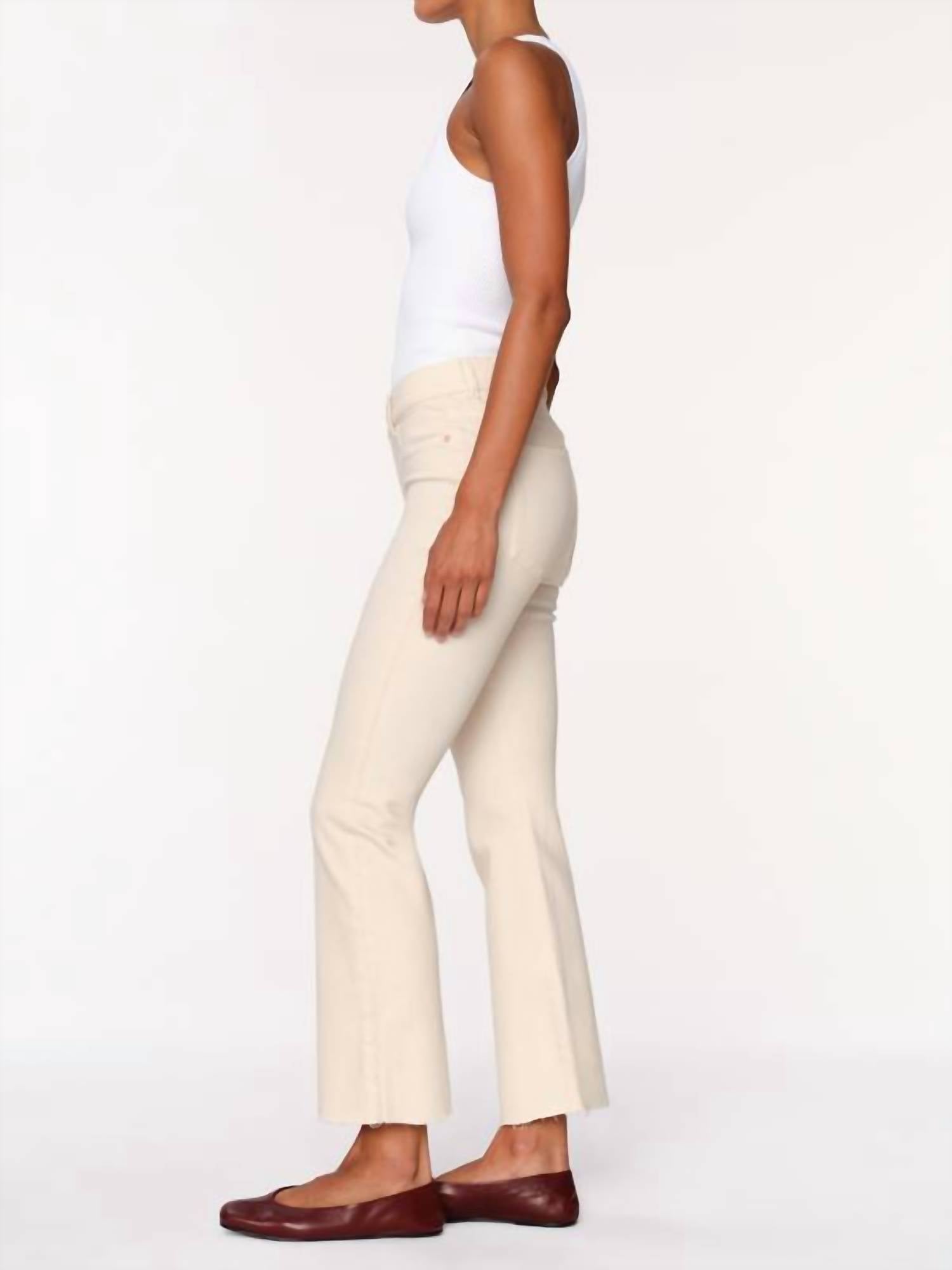 A boot-cut jean that not only looks good on, you'll be comfortable in them all day. Elevate your summer wardrobe with the Bridget Boot High Rise Instasculpt Jeans by DL1961, designed specifically for women. Expertly crafted from a cotton blend, these jeans feature a flattering high-rise waist with a 10-inch rise and a classic button closure. The solid, bootcut leg and 27-inch inseam make them a minimalist yet chic choice for vacation outings. Embrace timeless style with practical pockets and a versatile flax color, perfect for any summer occasion.
