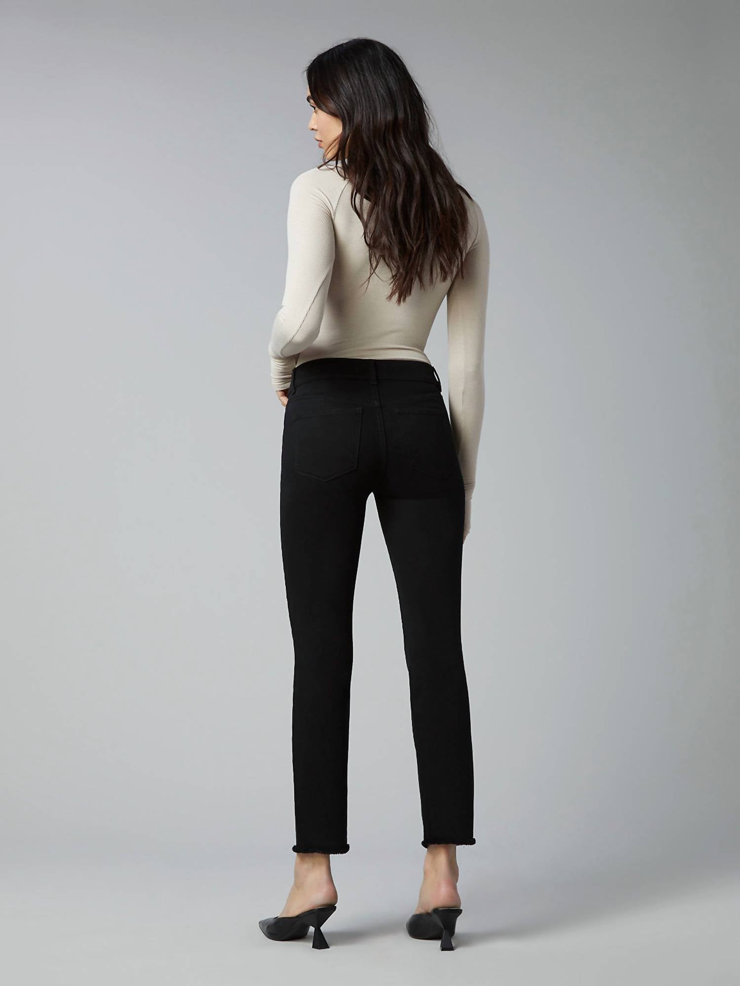 We especially love this cropped jean with a cute pair of slides or sandals. Discover the DL1961 Women's Mara Straight Mid Rise Instasculpt Ankle Jeans in Black Peached Raw, offering a seamless blend of style and comfort. These mid-rise, ankle-length jeans feature a slim fit with a 9" rise, 27" inseam, and 13.5" leg opening. Made from a cotton blend, they use DL1961's Instasculpt technology to smooth and sculpt your figure. Closure is secured with a button closure, ensuring a perfect fit every time. Care: Machine wash and tumble dry. Ideal for a trendy workwear look or stylish summer travel.